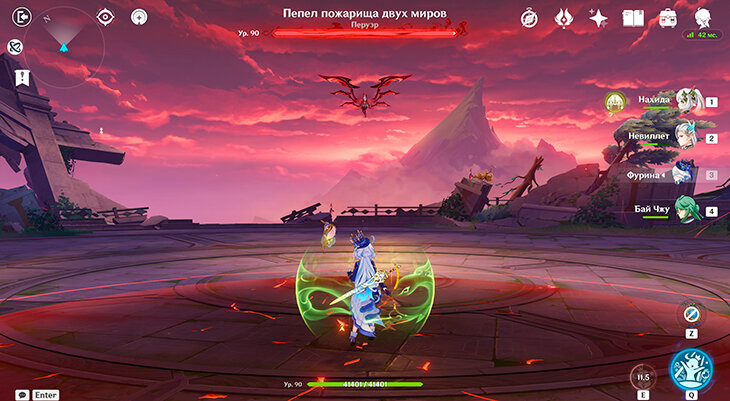 У Перуэр 70% сопротивления Пиро, поэтому возьмите команду, где основной дпс и второстепенные не относятся к этой стихии, но Беннета или Шеврез, например, брать можно, т.к. они не особо вносят собственный урон, а их бафф будет полезен команде. В остальном команда может быть любой, главное иметь хилера, чтобы снимать с себя долг жизни.