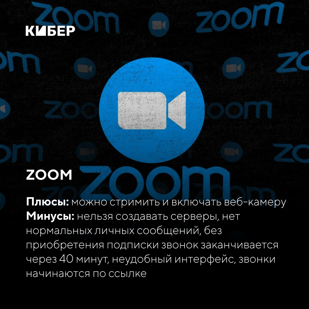 Очень популярный сервис для общения и видеозвонков. Все благодаря удобству в использовании и стабильной связи при минимальной задержке. Даже бесплатная версия предлагает много чего, например конференции до 100 человек в формате HD-качества. Однако есть ограничение по времени – 40 минут для каждого участника.