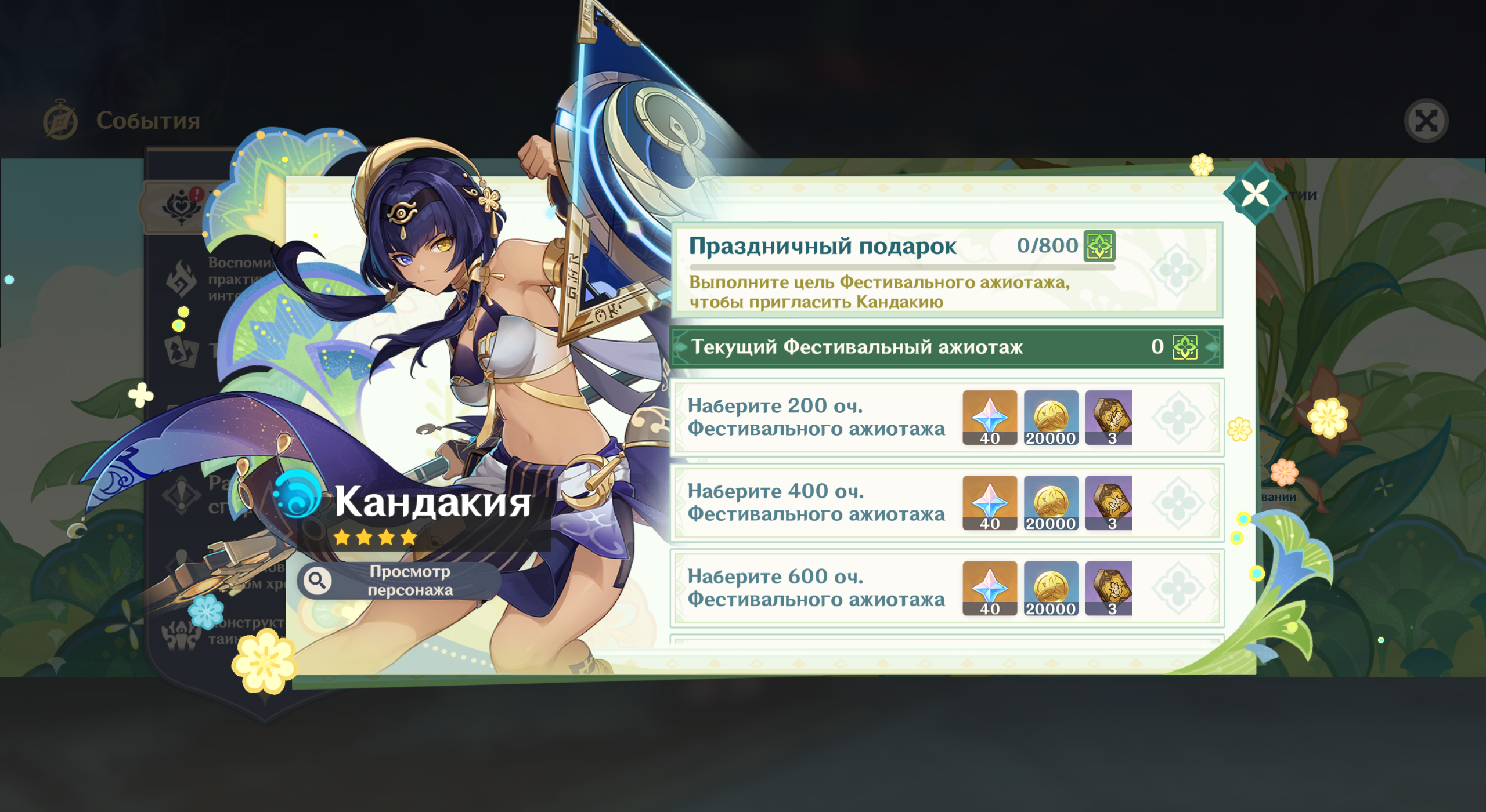 Фестивальный ажиотаж – валюта, работающая только в рамках главного ивента. Она зарабатывается прохождением всех его активностей, включая мини-игры и сюжетную линию. 200, 400 и 600 очков Фестивального ажиотажа дадут примогемы, мору и книги талантов, а за 800 очков получится бесплатно забрать 4-звездочную Гидро копейщицу Кандакию. Пройдите все этапы Праздничного события с наилучшим результатом, чтобы получить максимальное количество единиц ажиотажа.