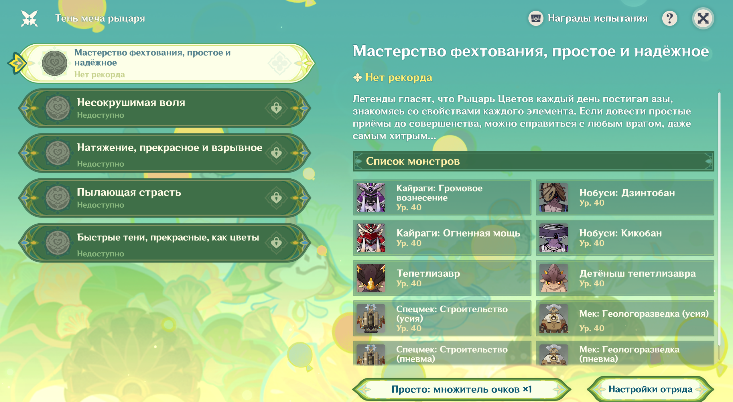 Этот этап предоставляет преимущества командам, играющим от реакции Пар. Вы можете построить ее из своих персонажей или пробных: Шилонен, Муалани и Сян Лин. На последний слот лучше всего подойдет еще один Пиро саппорт – Беннет, Тома, Дэхья. Шеврез тоже можно использовать, но ее пассивный талант не будет работать в данном случае, так как отряд состоит не только из Электро и Пиро.