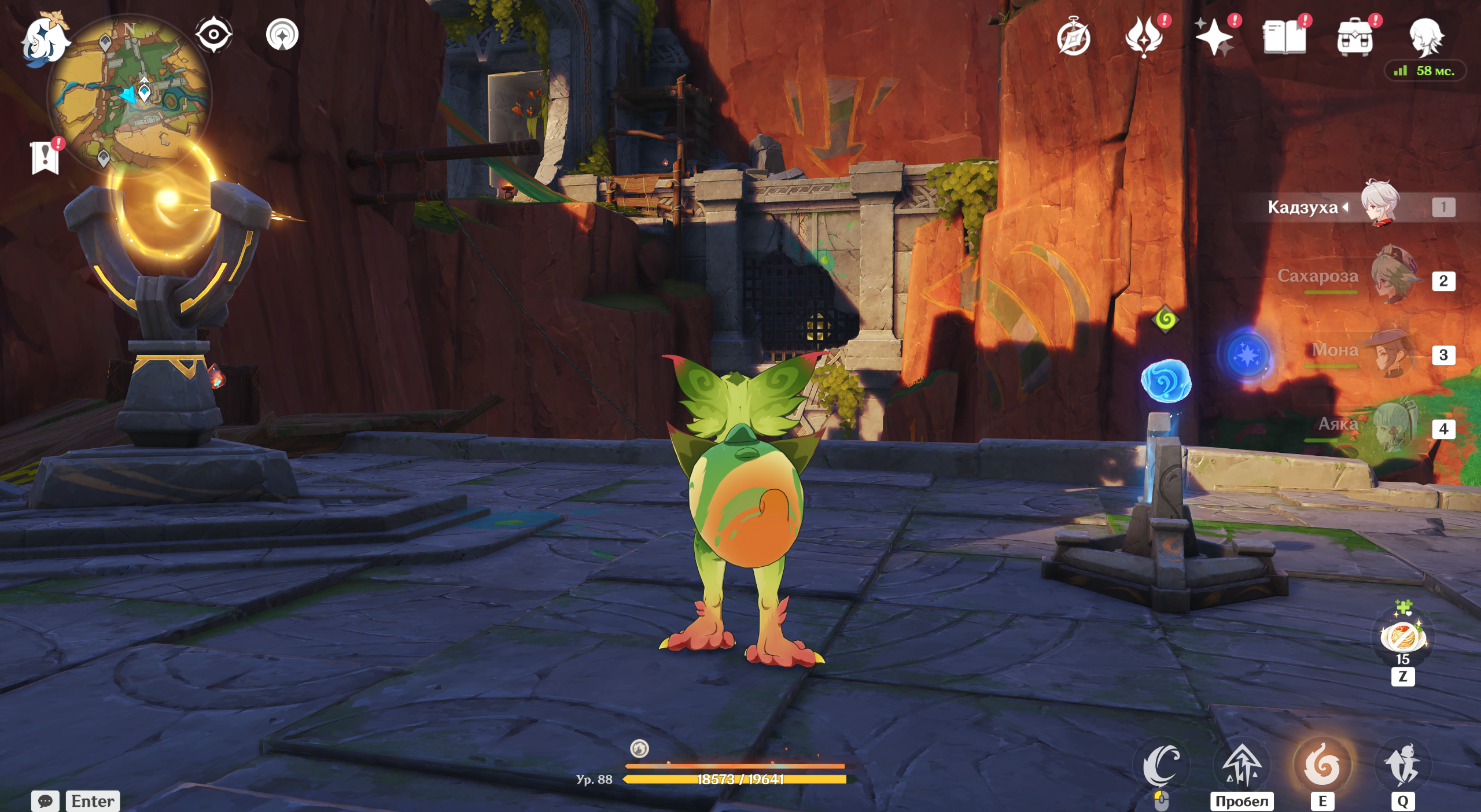 Вселитесь в Юмказавра, притяните желтую Сферу передачи и с помощью навыка отправьте ее на платформу соответствующего цвета.