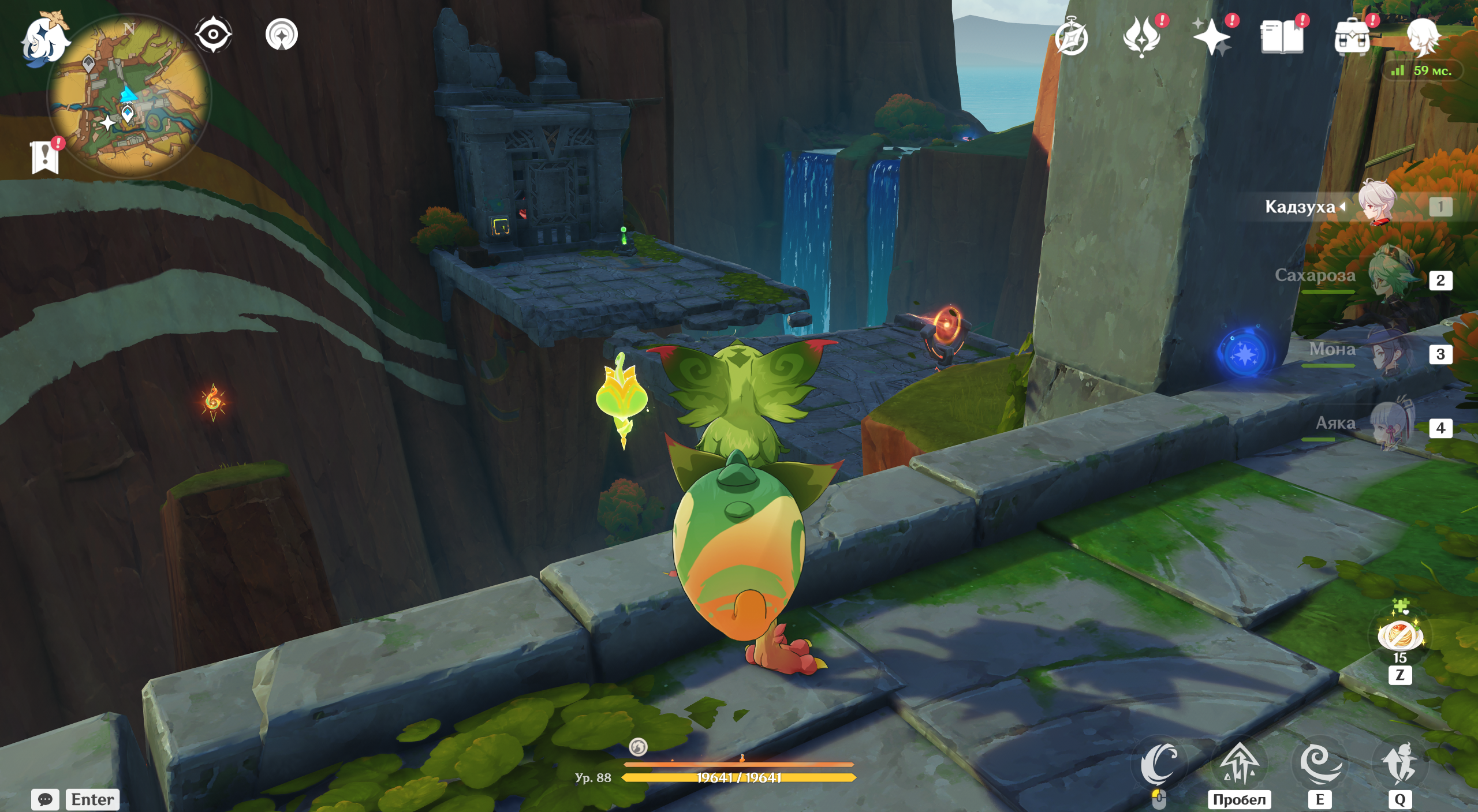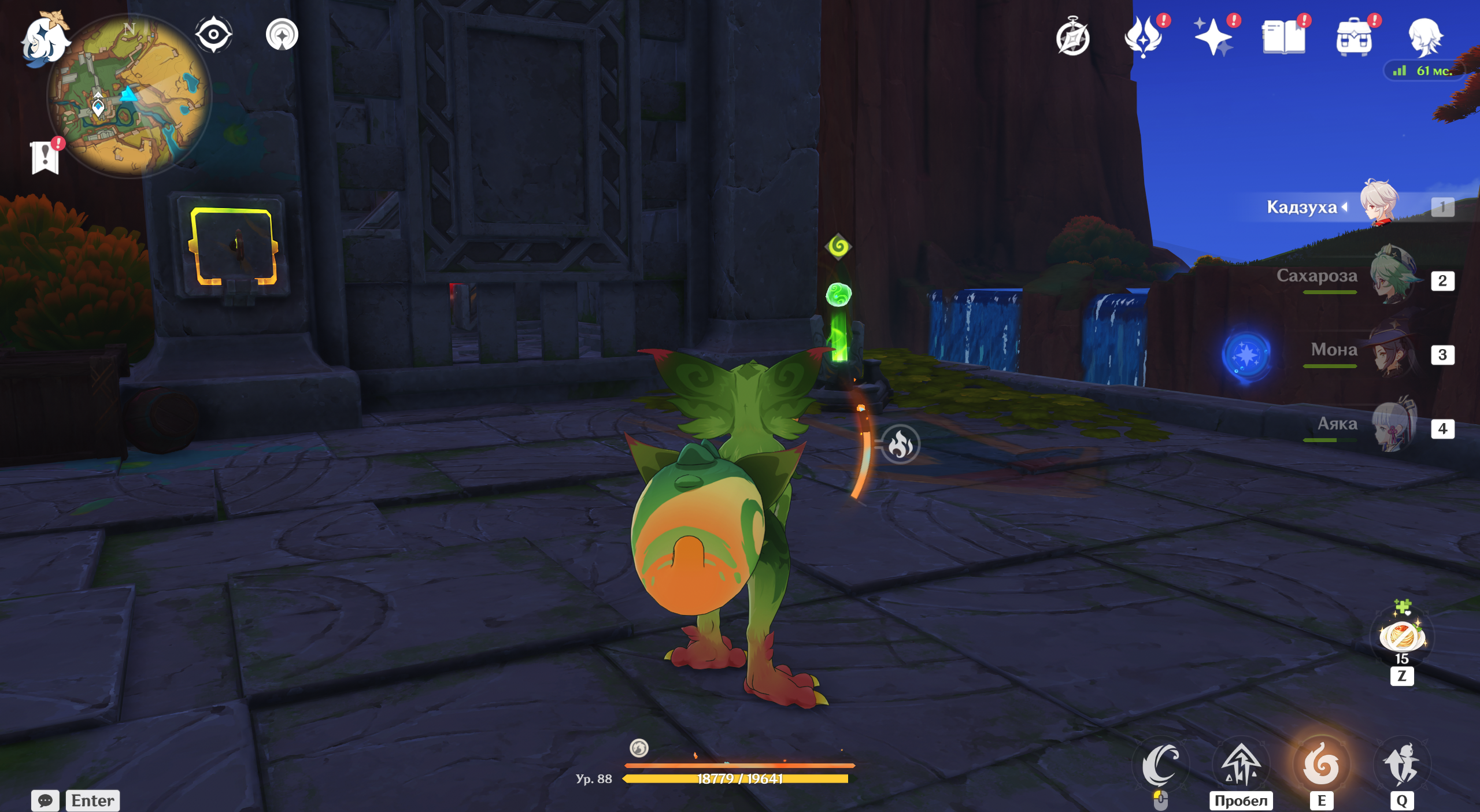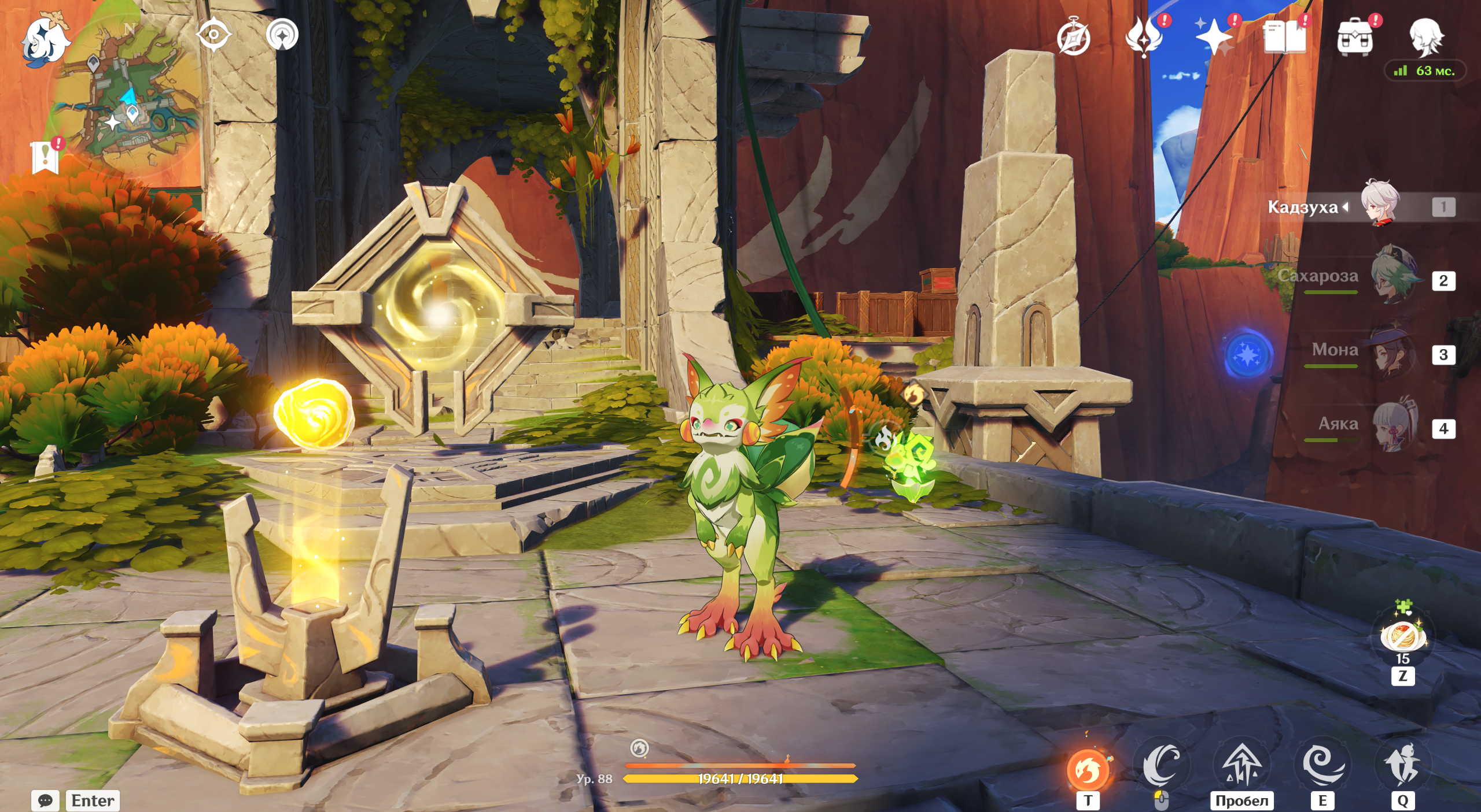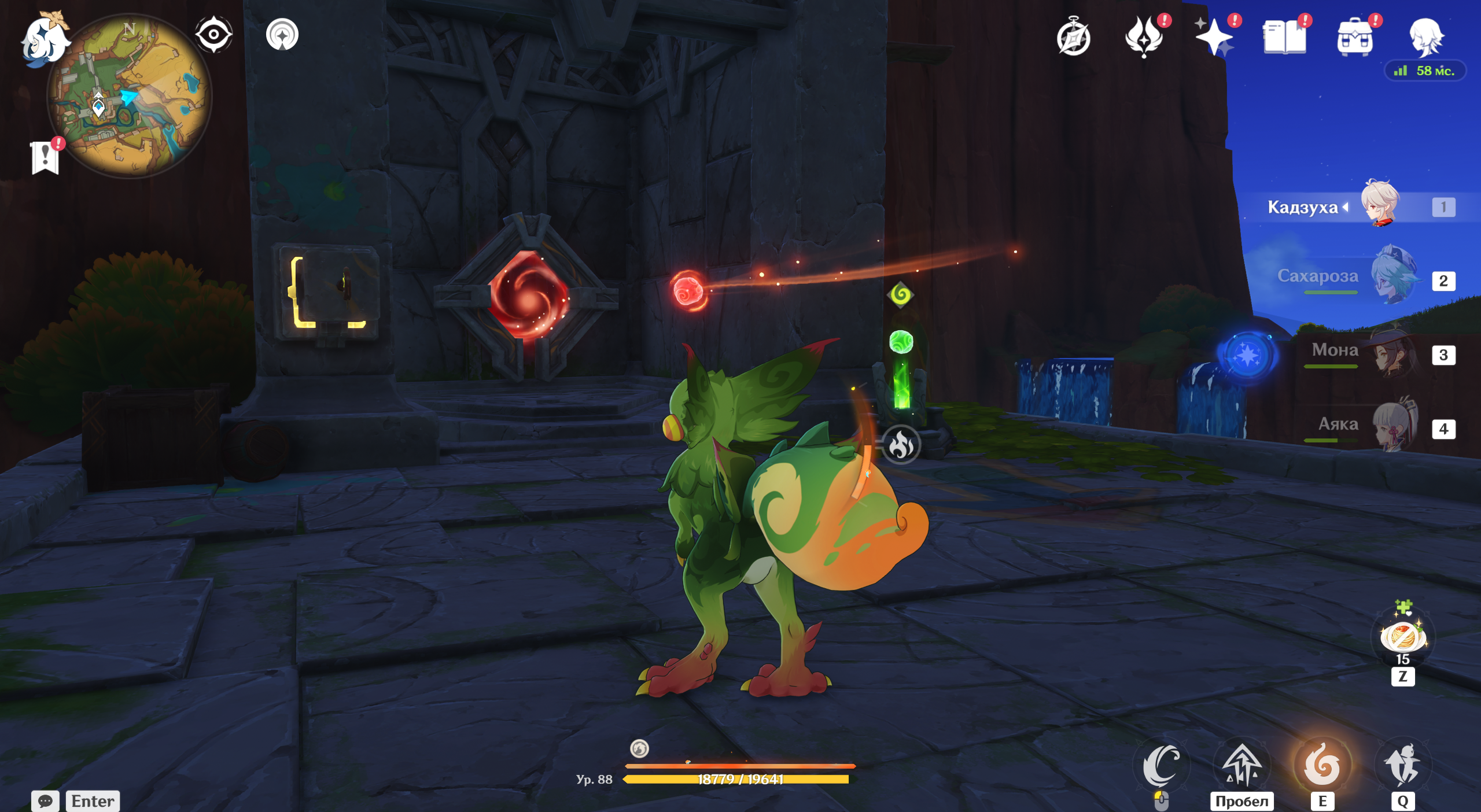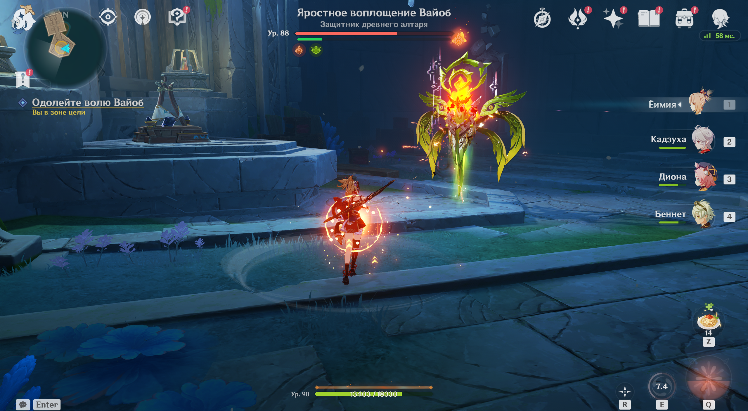 Битвы у алтаря не миновать – перед вами появится Воплощение Вайоб стремительности и листвы. Босс имеет 50% сопротивления к Дендро-элементу, поэтому сражаться с ней героями стихии не рекомендуется. У него также есть атаки по площади и те, что отнимают вашу энергию в поле действия его навыков. При этом щит сильно снижает входящий урон.