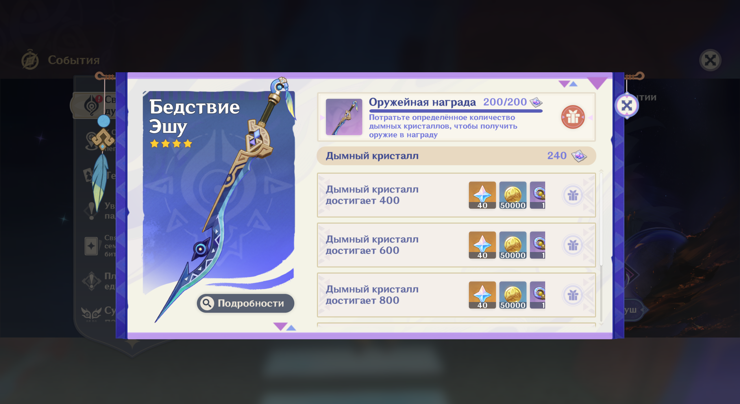 Дымный кристалл – валюта ивента. Вы получаете ее за прохождение мини-игр и закрытие сюжета. Чем больше у вас очков – тем больше Дымных кристаллов. Обменять их можно на примогемы и эксклюзивный одноручный меч «Бедствие Эшу».