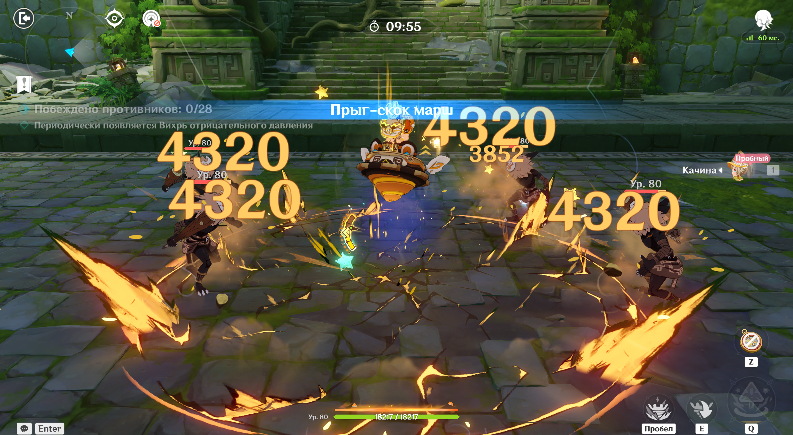 Как пройти: Побеждайте противников с помощью элементального навыка – больше ничего от вас не требуется. Флогистон в испытаниях не кончается, так что спамить буром Качины можно до бесконечности.