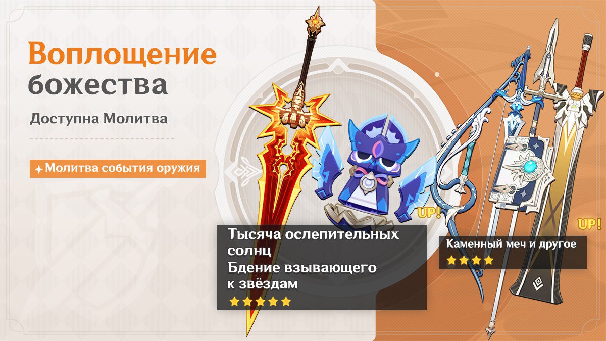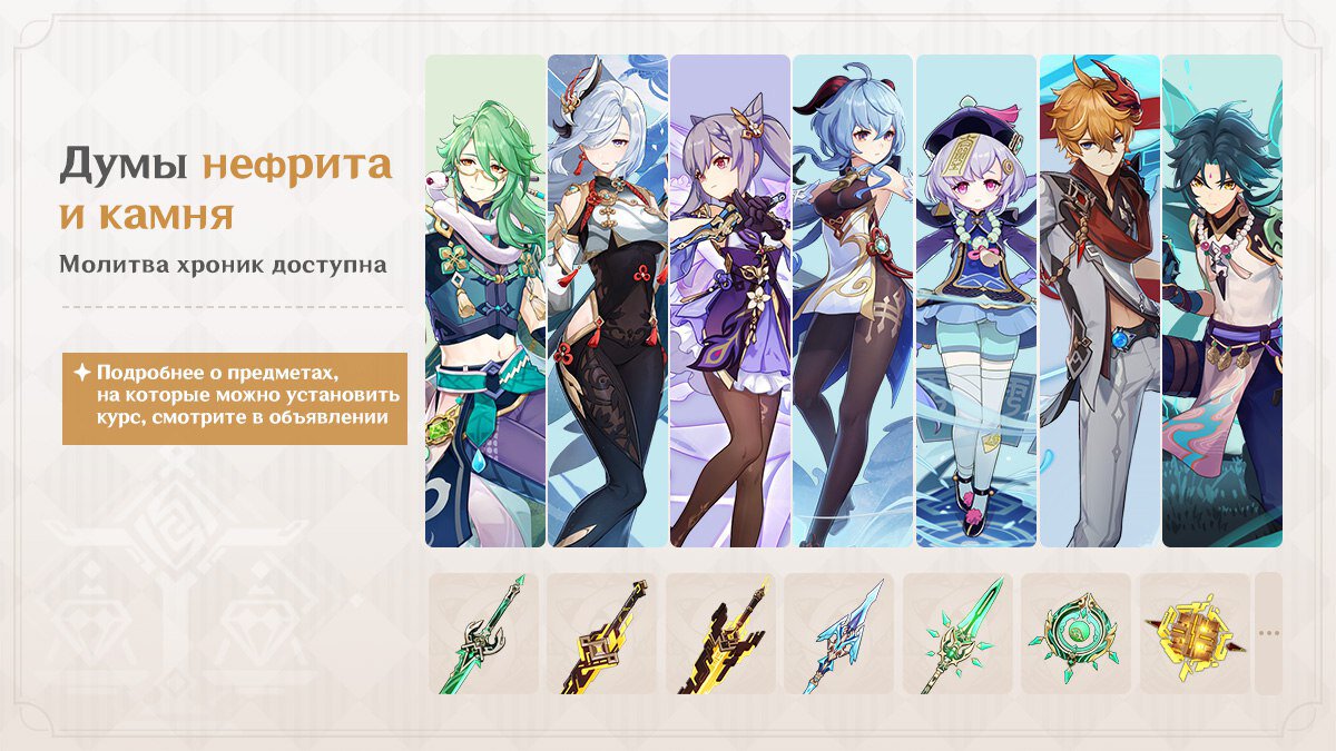 Долгожданная Молитва Хроник вернулась с персонажами Ли Юэ и их оружием. Она стартует во второй половине обновления, вместе с баннерами Арлекино и Клоринды.