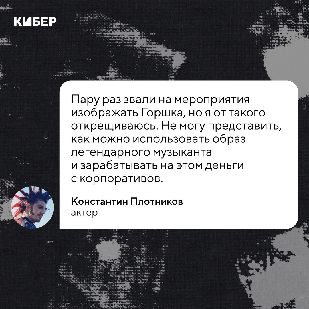 Костя Плотников: Пару раз звали изображать Горшка, но я от такого открещиваюсь. Не могу представить, как можно использовать образ легендарного музыканта, которого мне выпала честь играть, и зарабатывать на этом деньги с корпоративов. Мозг даже не поворачивается думать в эту сторону.