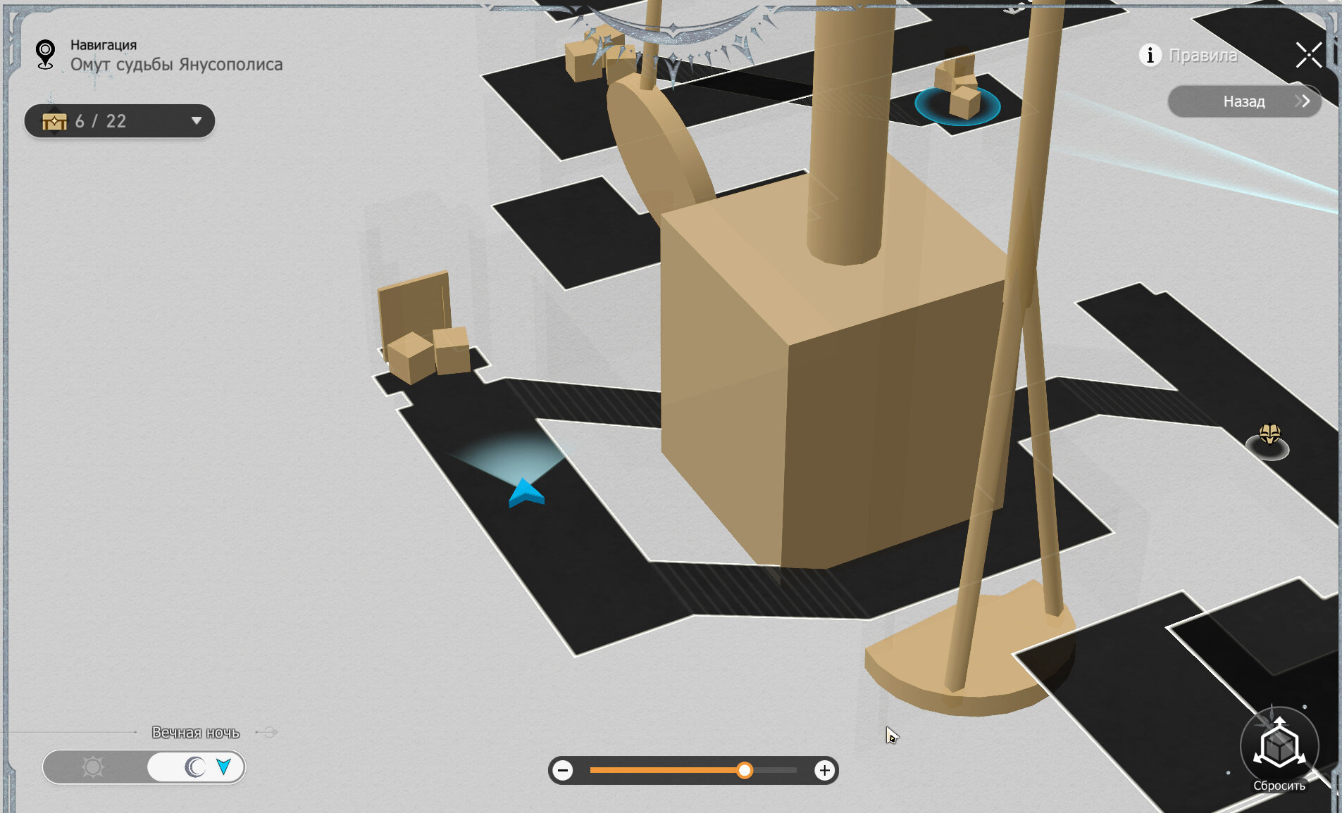 - Движение: поднимитесь на самый верх по лестницам и спрыгните вниз. С постамента спрыгните направо на кнопку. После этого 8 раз нажмите налево-направо, чтобы тень почти дошла до вас. Потом сделайте три шага налево.