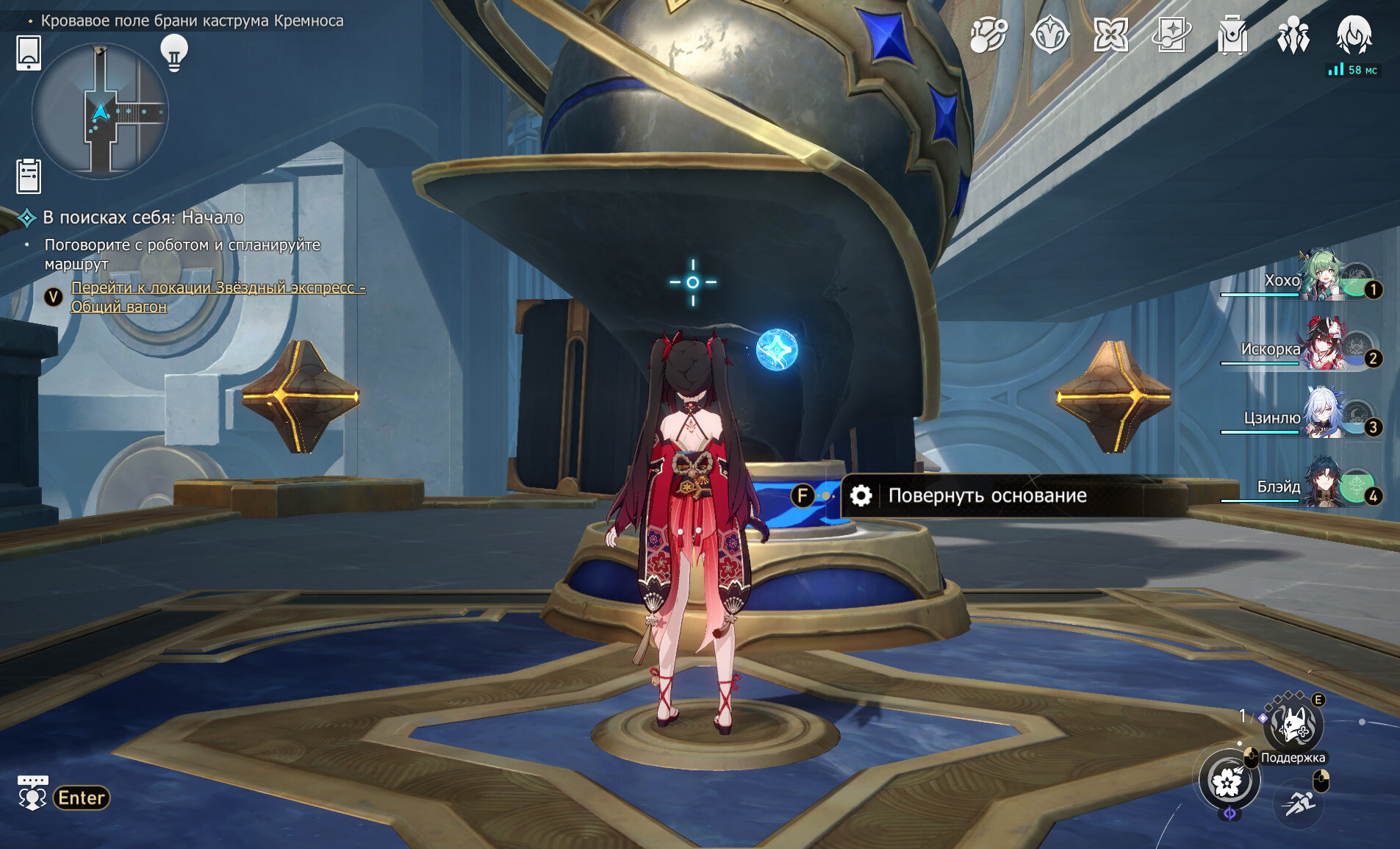 Возьмите усиление молитвы и возвращайтесь к первому шару. Нужно использовать на нем усиленную молитву, чтобы он встал на подставку. Когда он встанет на место, используйте поворот основания, чтобы он пробил ящики сзади на скриншоте.