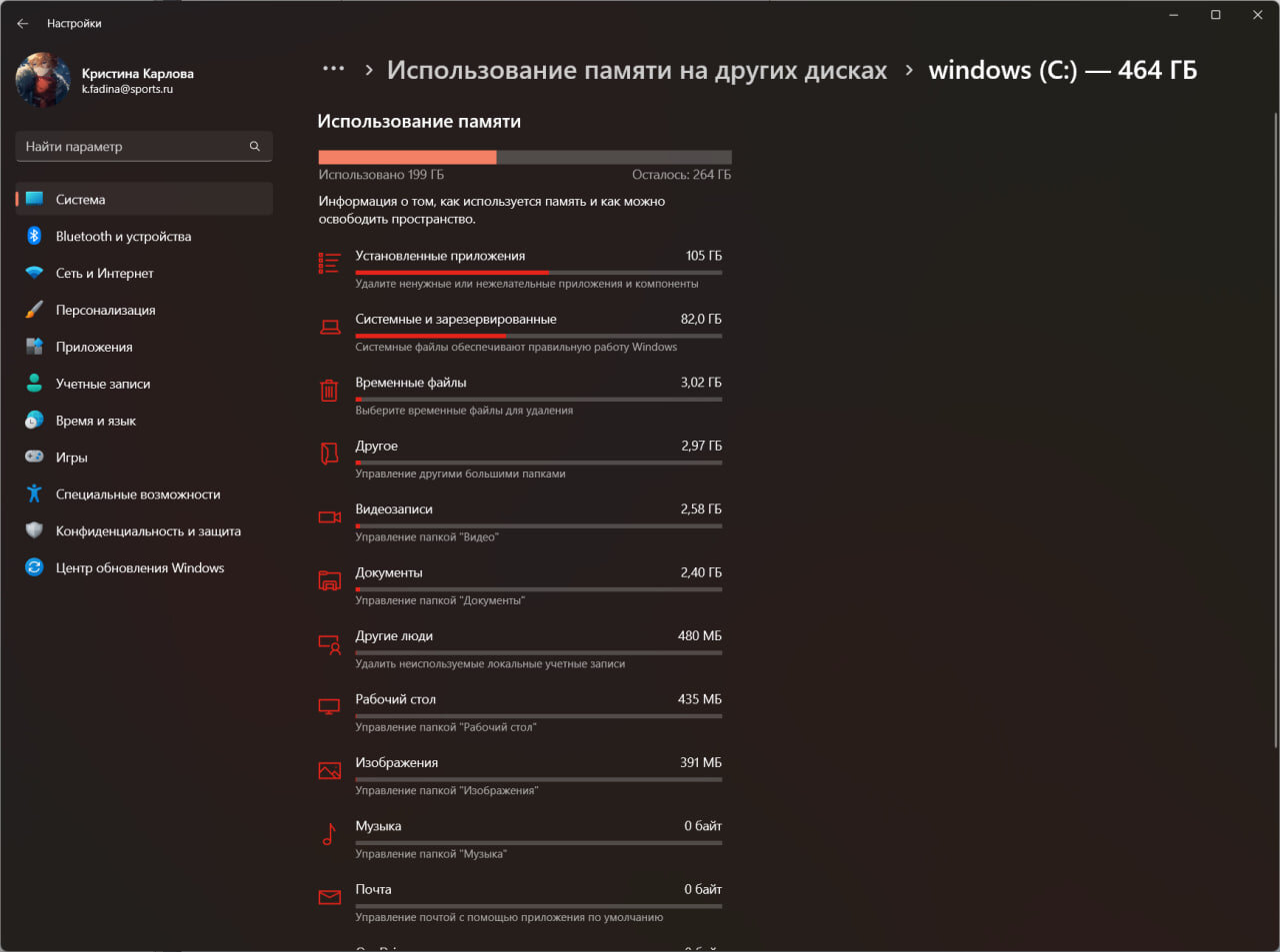 Появится окно параметров, в котором указано, сколько места занимают приложения, системные файлы, временные файлы, документы и так далее. Можно покликать по ним и узнать, что именно занимает больше всего места.