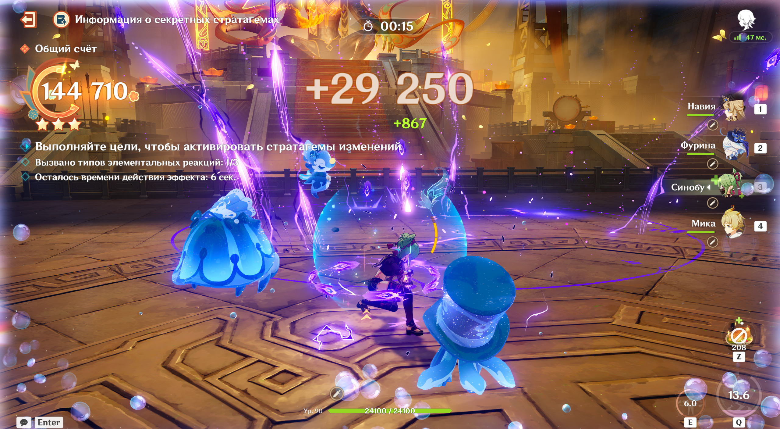 Берите Крио и Гидро героев и добивайте врагов, пока они заморожены, чтобы получать больше очков. Подойдут Гань Юй, Розария, Барбара, Е Лань, Кэйа, Аяка, Тарталья и другие.