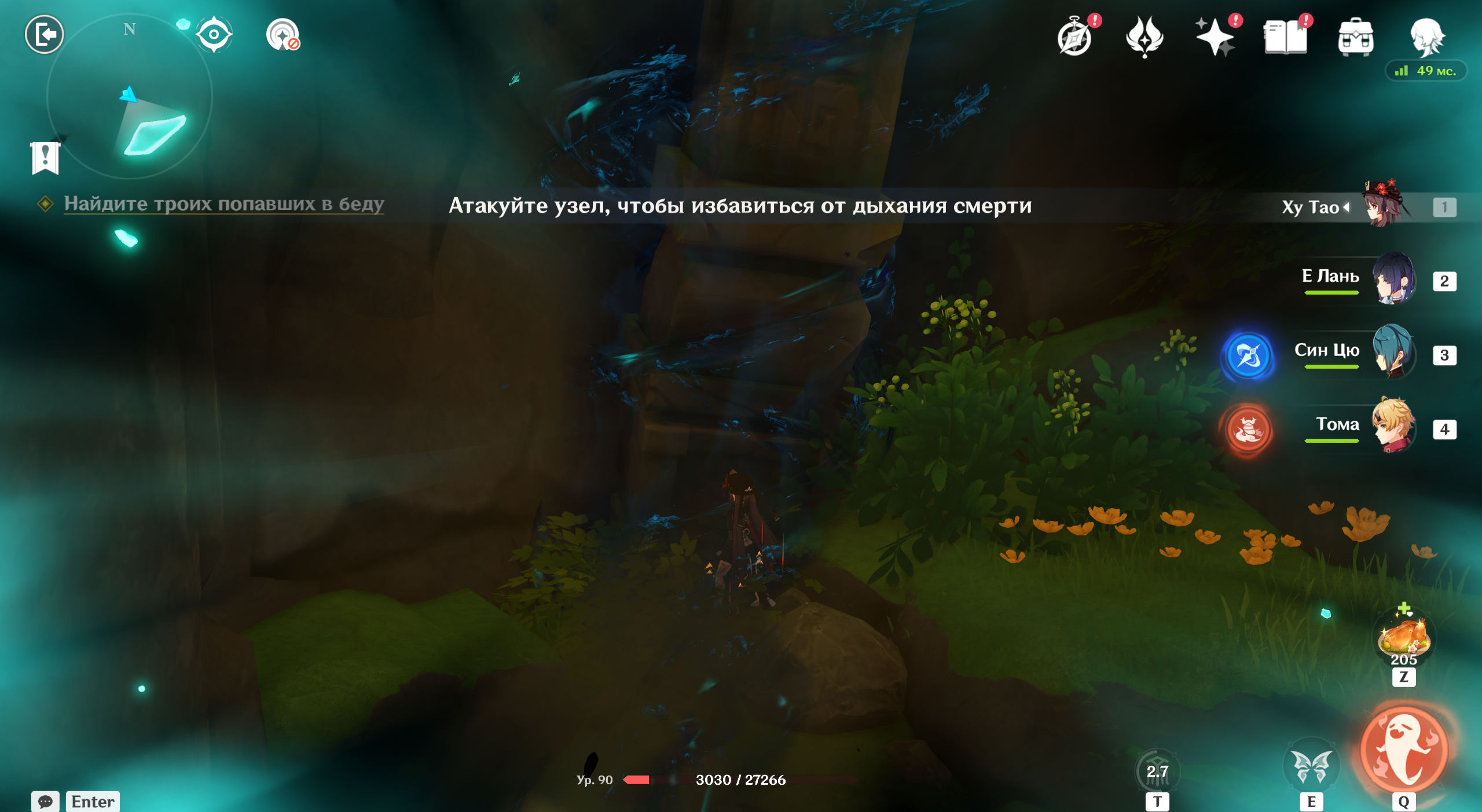 Сяо даровал вам способность видеть скверну – воспользуйтесь ей, когда попадете «За Грань». На ПК вы можете сделать это через клавишу T. Атакуйте узлы, чтобы продвигаться дальше.