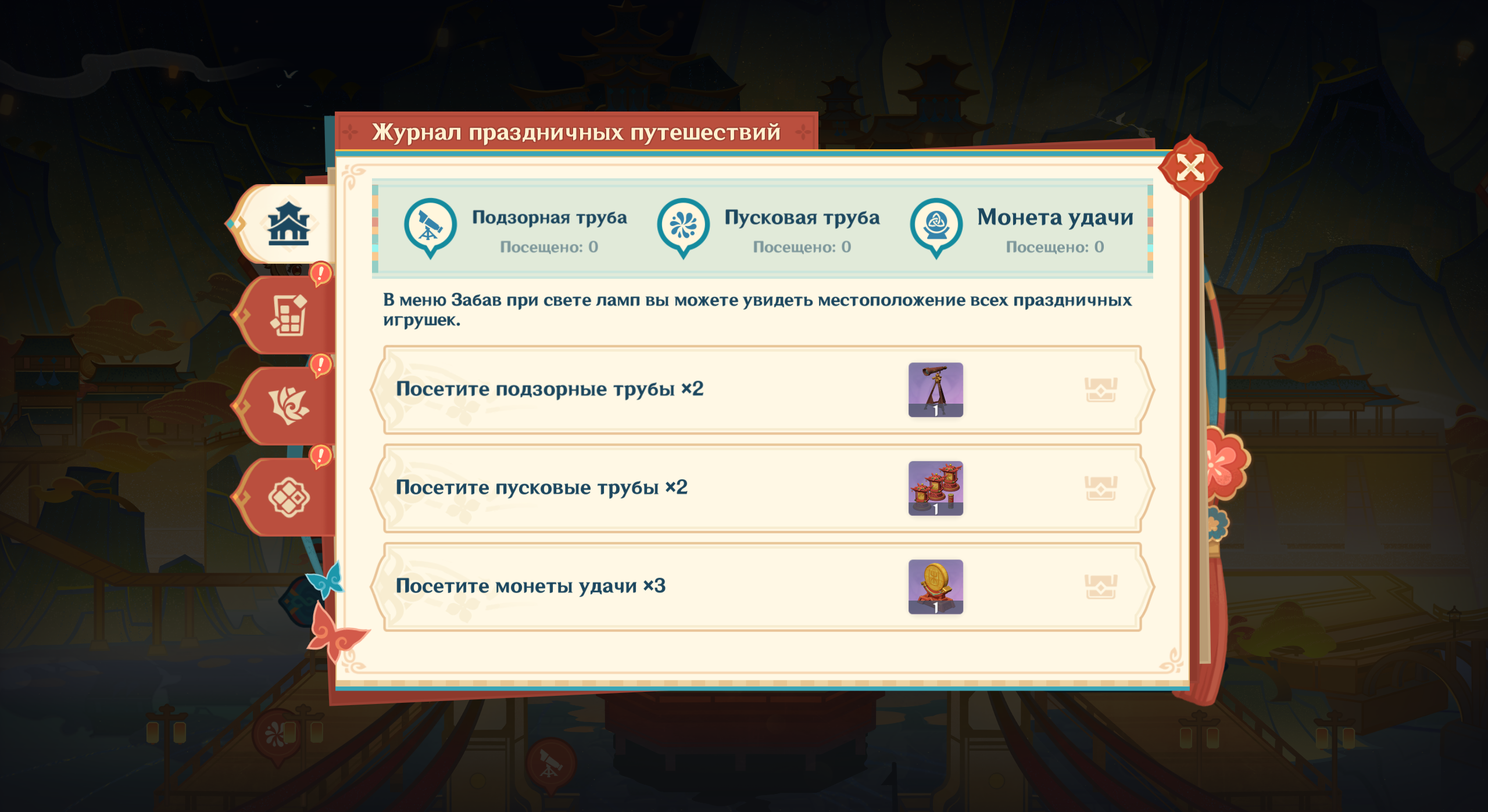 ● забавы при свете лампы – выход к мини-играм. Тут на карте отмечены праздничные игрушки: если посетить их места и активировать, получите декор для Чайника Безмятежности и украшения для создания конвертов этапа «Персональные подарочные конверты»;