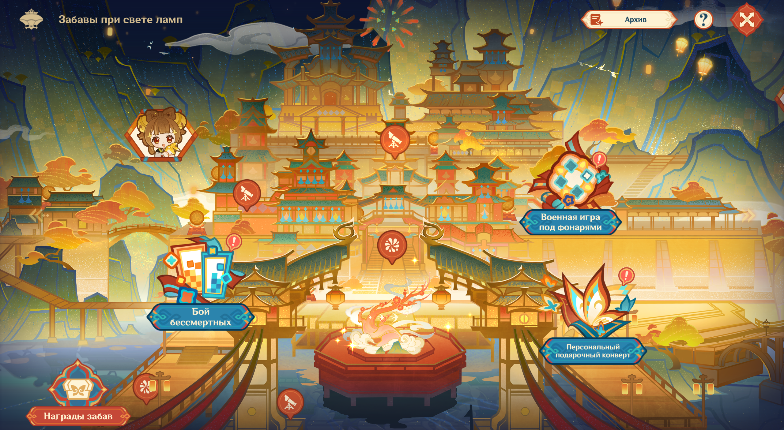 В меню «Забавы при свете лампы» → «Награды забав» есть отслеживание прогресса всех мини-игр: Бой бессмертных, Персональный подарочный конверт и Военная игра под фонарями.