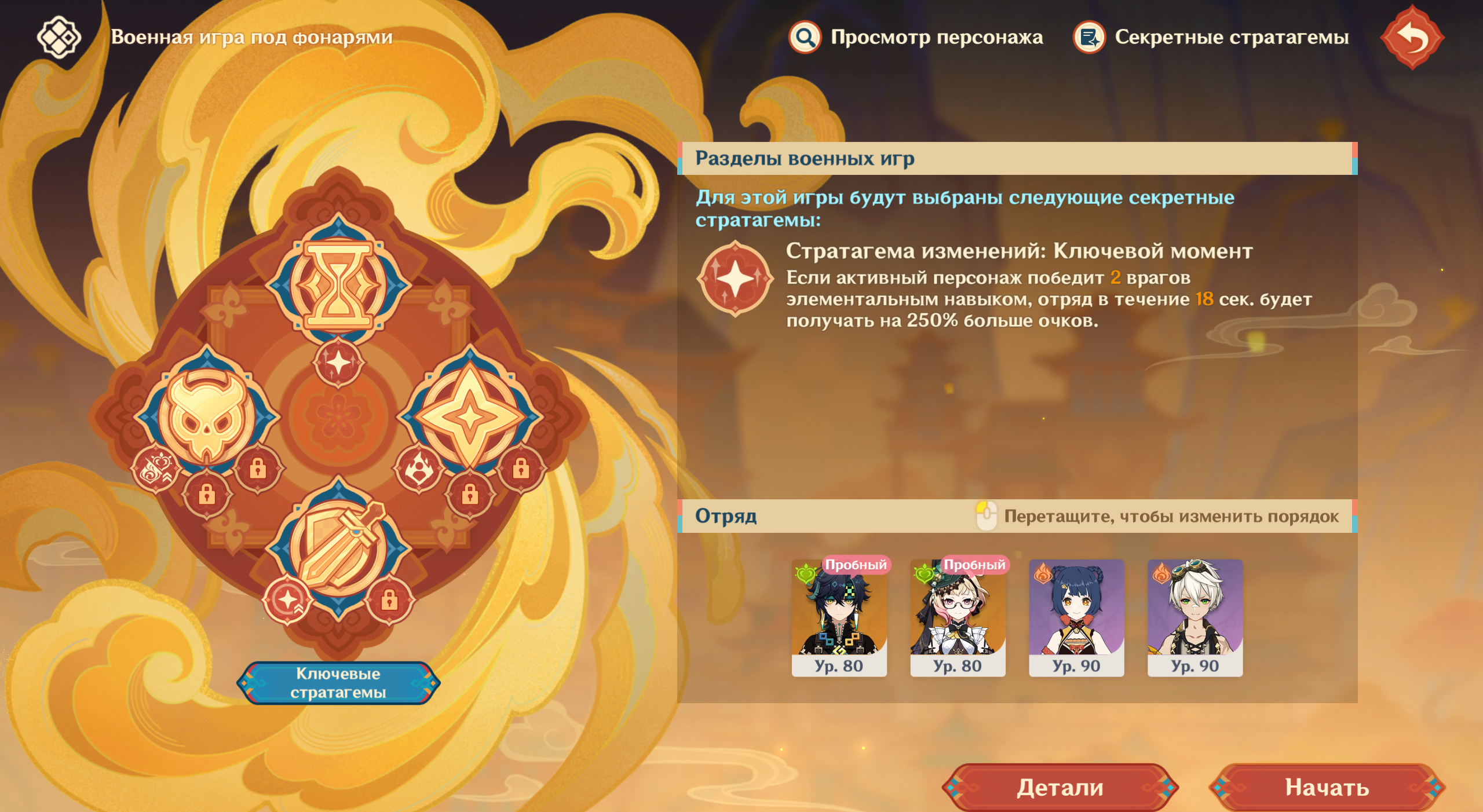 На уровне 1 стратагема, которую невозможно поменять – Стратагема изменений. Она гарантирует вам бафф на 250% увеличения очков, если вы уничтожаете врага элементальным навыком в течение 18 секунд.