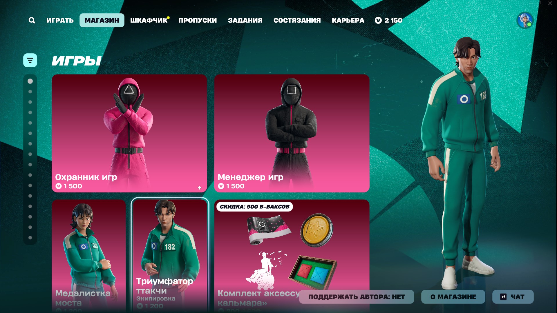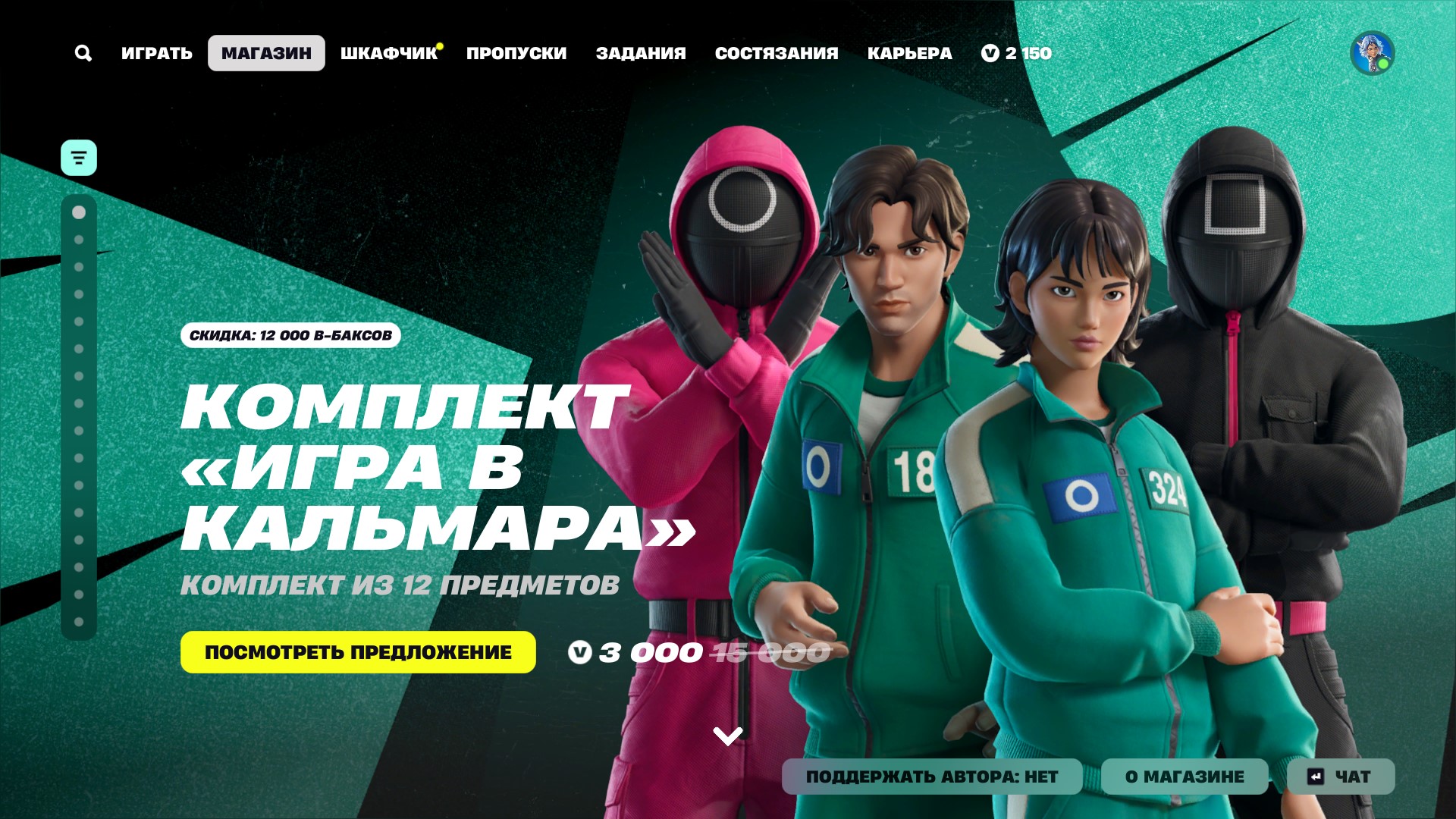 Во время события в режиме «Перезарядки» в магазине Fortnite появились наборы скинов и масок по «Игре в кальмара». В главный комплекс вошли облики охранника и менеджера игр, а еще 10 участников испытаний. По скидке он стоит 3000 В-баксов.