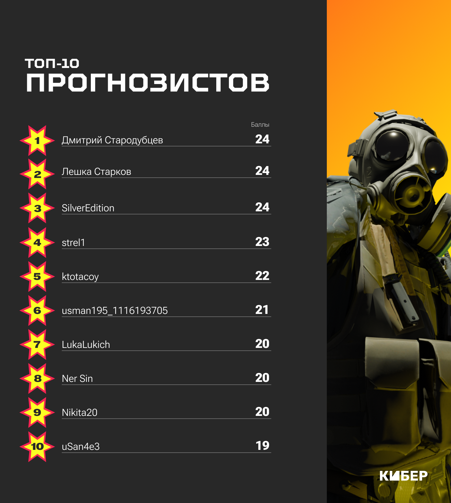При равенстве очков у двух или более участников выше в рейтинге будет тот, кто угадал больше точных результатов. При равенстве этого показателя выше окажется тот, кто угадает больше исходов в матчах формата bo3, затем в bo2, после в bo1. При равенстве всех показателей выше будет участник, который оставил прогноз на игровой день раньше конкурента.