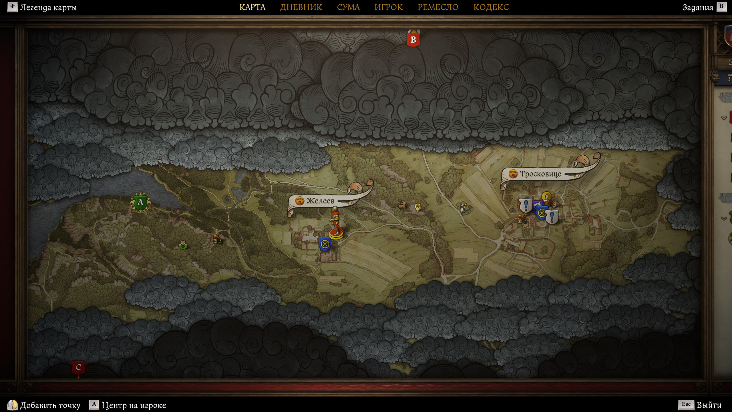 Индржих может перемещаться в любое время из любого места, но сперва нужно открыть точки быстрого перемещения в месте, куда вы собираетесь. Такие точки на карте отмечаются синими щитами. Чтобы открыть точку, нужно дойти до нее в игре: когда на экране появится надпись, что вы ее открыли, она добавится на общую карту мира.