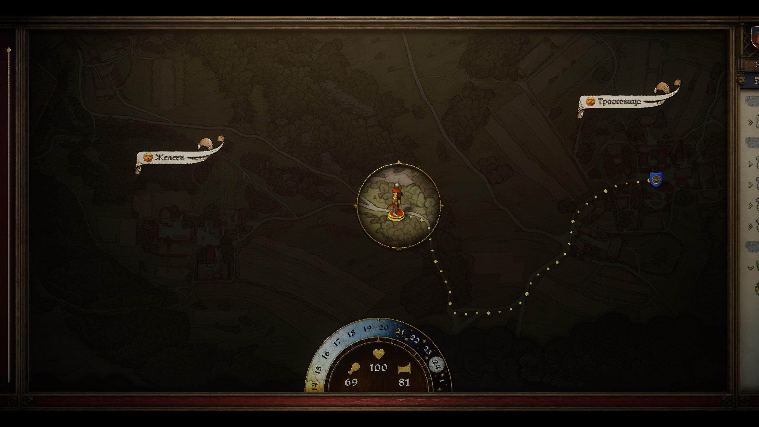 Уникальность в том, что моментального перемещения все равно не будет. Вы будете наблюдать за тем, как фигурка идет по заданному пути. Во время этого путешествия нужды Индржиха срабатывают так, как срабатывали бы при обычной езде: он будет испытывать голод или захочет поспать после долгой дороги. Помимо этого, Индржих может столкнуться со случайным событием – чаще всего это нападение разбойников или встреча со странствующим торговцем. В таких случаях вам дается несколько секунд, чтобы выбрать вариант действия. У каждого действия указан шанс: например, при встрече с врагами шанс побега может не сработать.