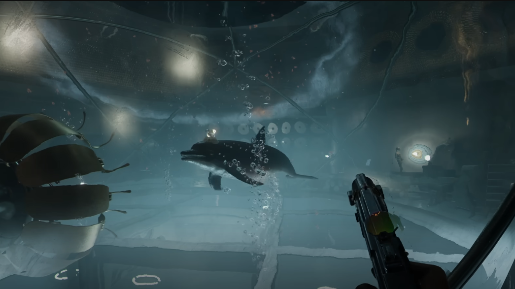 Покиньте здание на лифте и уничтожьте кладку в лаборатории, а после прыгайте в люк в полу. Проплывите дальше и выберетесь на поверхности, где надо зайти в шлюз. Далее подберите водолазную маску, активируйте красную кнопку и окажитесь в открытой воде.