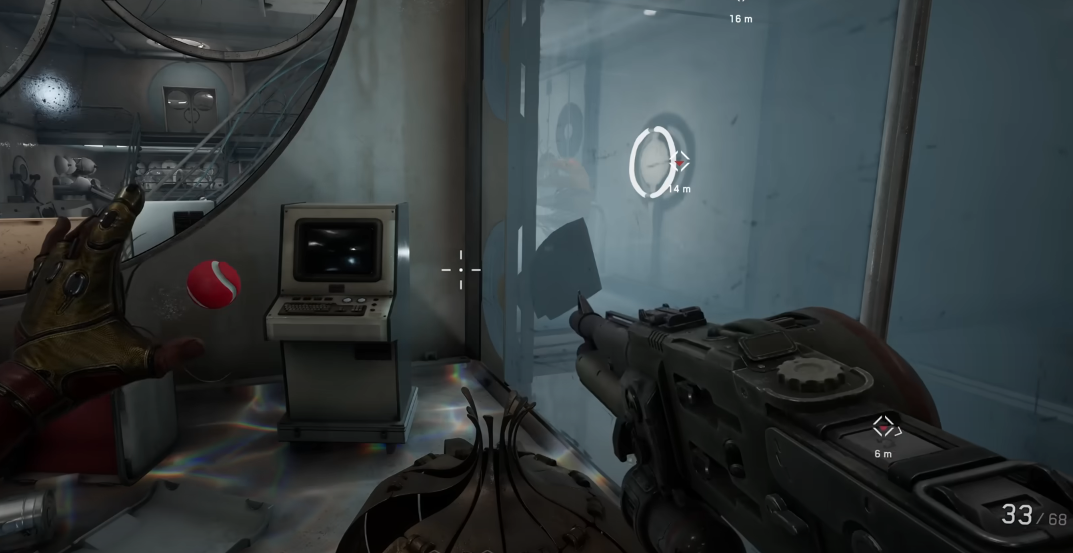 При помощи крюка продолжайте движение по комплексу. Найдите лестницу, находящуюся справа от таблички «Администрация». Там вы восполните ресурсы и найдите на офисном столе щебетарь «Конфуз».