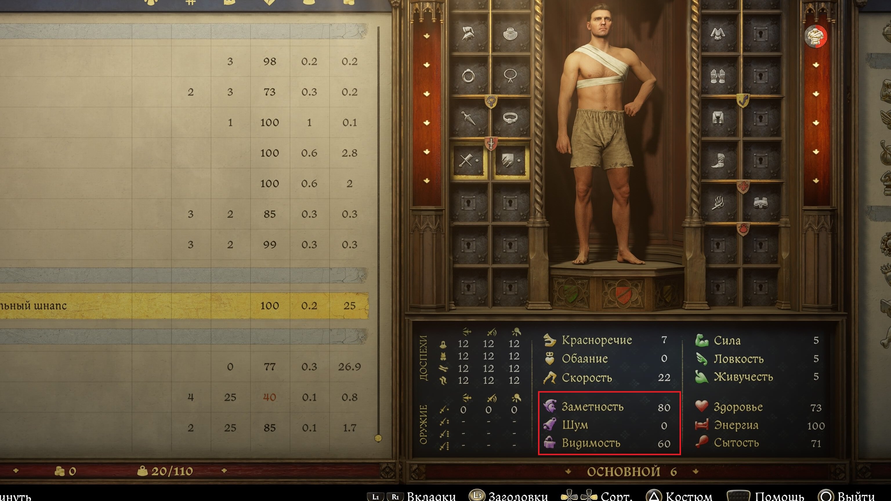 Параметры вроде заметности тоже зависят от одежды. Когда решите что-нибудь украсть, снимите тяжелый доспех и яркую рубаха – тогда держаться в тени будет легче.