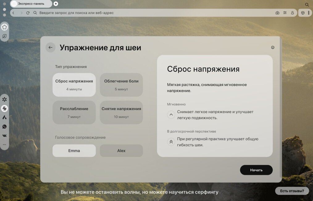 В отличие от обычных браузеров, Air не только обещает удобный способ доступа в интернет, но и «позаботится о психологическом состоянии» пользователей, предлагая направленные медитации, дыхательные упражнения и упражнения для шеи.