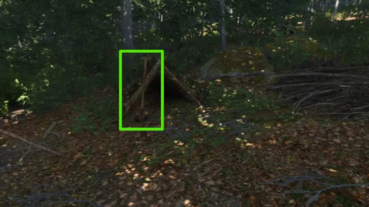 По прибытии к месту назначения Кубенка спешивается и ведет вас пешком через лес. В самом лагере обратите особое внимание на лопату возле одной из палаток – этот инструмент понадобится для выполнения последующих задач квеста.