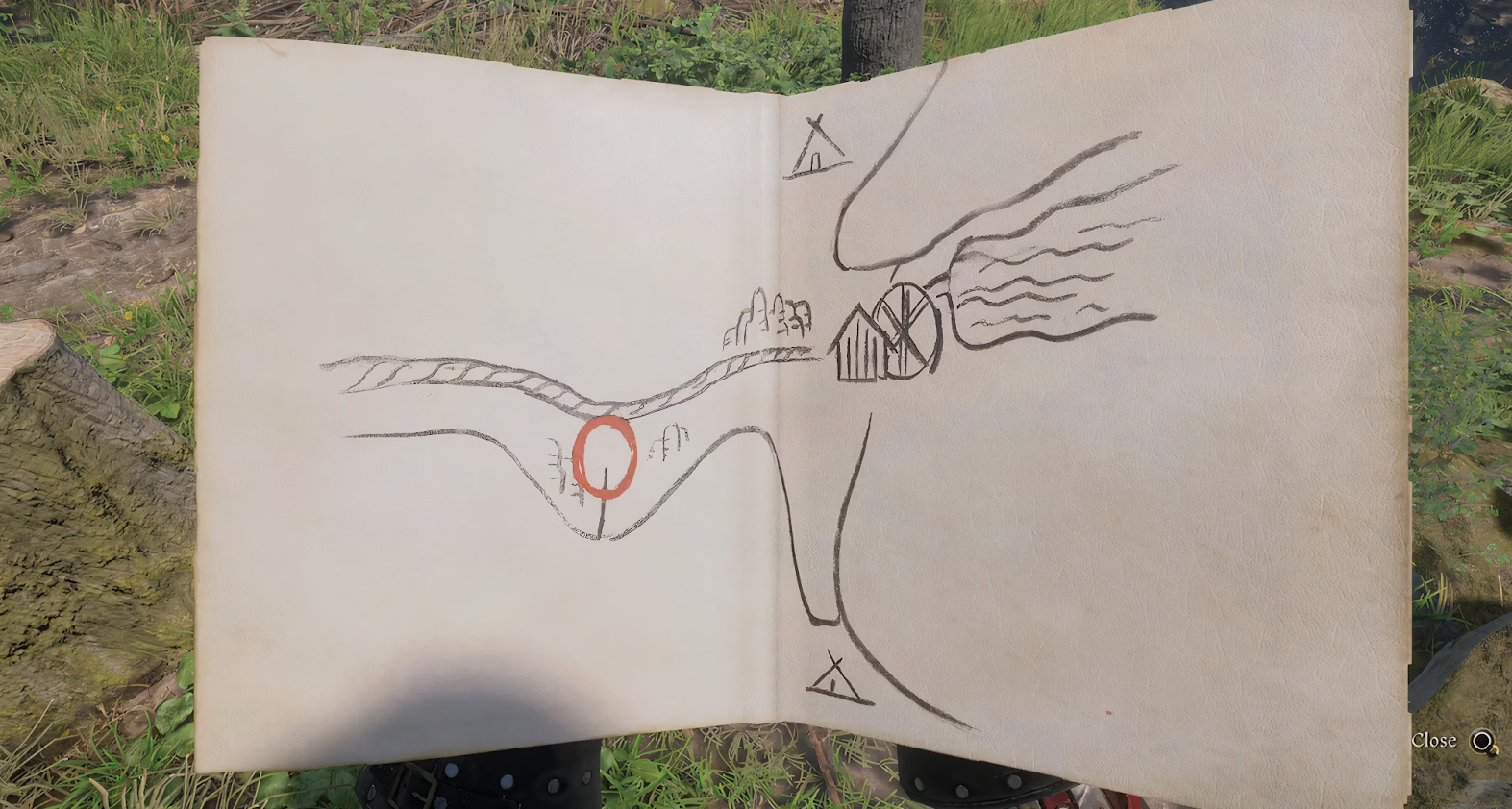 Изображение на карте указывает, что клад лесорубов находится в западной стороне от лагеря, к югу от ручья рядом с извилистой тропинкой. Дополнительным ориентиром может служить маркер «Расчищенное место» на карте региона. Сначала следуйте по тропе, затем поверните на север к небольшому оврагу. Посмотрите вниз и увидите сундук со сложным замком. Если не достигли высокого уровня взлома, нужно отправиться на поиски ключа.