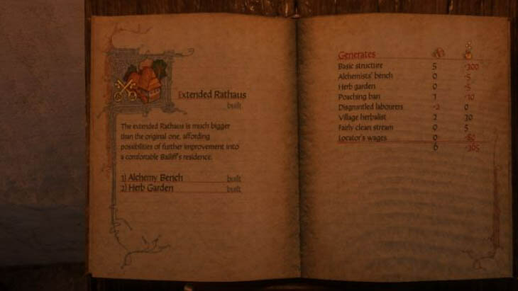 Когда ежедневный доход превысит 2000 грошей, можно приступать к восстановлению костела и модернизации ратуши. Отремонтированный храм повысит уровень счастья жителей. В улучшенной ратуше появится возможность установить алхимический стол и разбить огород для выращивания лечебных трав.