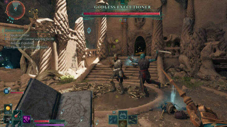 После получения реликвии вас ждет серьезное испытание. Предстоит сражение с группой скелетов и их лидером – Безбожным Палачом. Первым делом уничтожьте скелета–жреца, который лечит остальных противников. Будьте готовы уклоняться от мощных атак сверху.