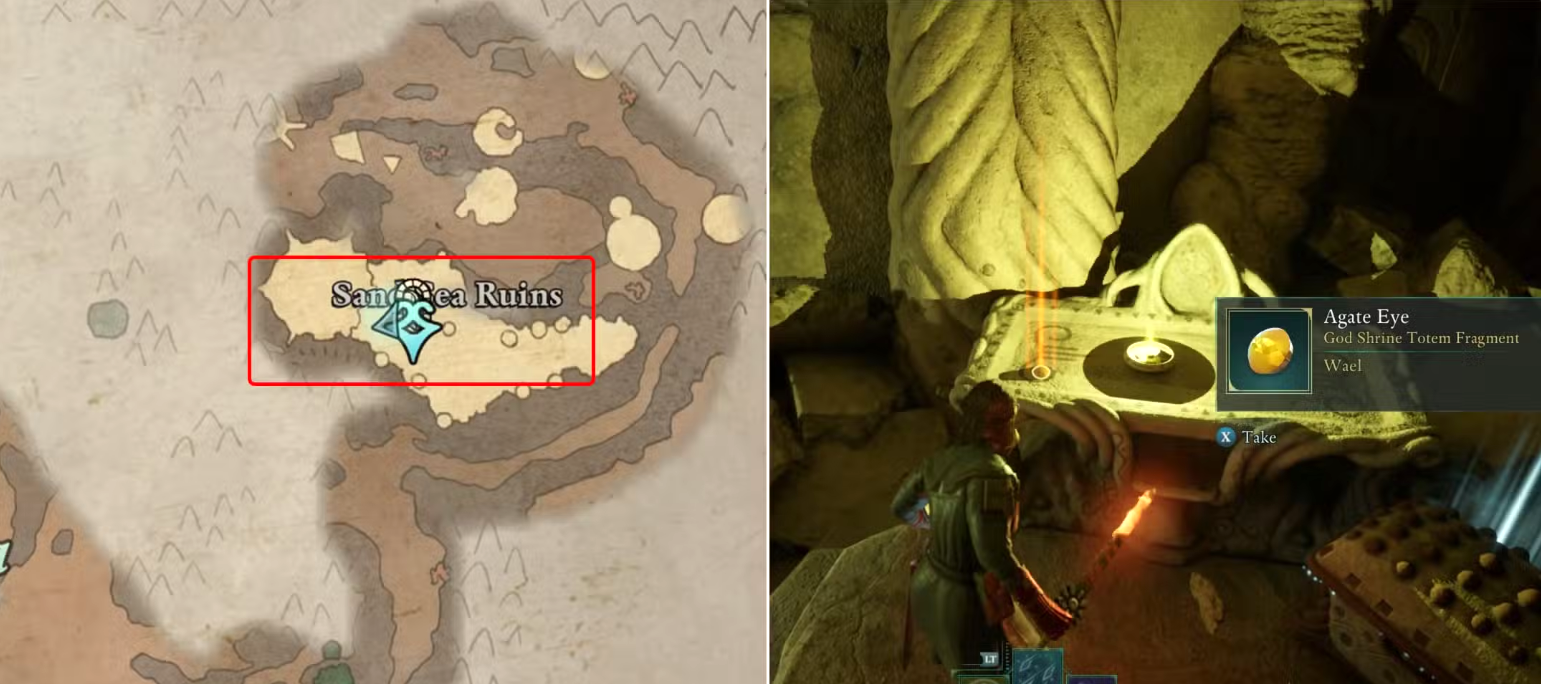 Хотя руины Моря Песков известны своим подземельем, искомый Агатовый глаз находится в их внешней части. Для начала поисков выберите северную сторону комплекса. Используя сохранившиеся элементы древних построек и временные деревянные конструкции, поднимитесь к верхним уровням руин. Ваша цель – попасть в круглое строение на возвышении.