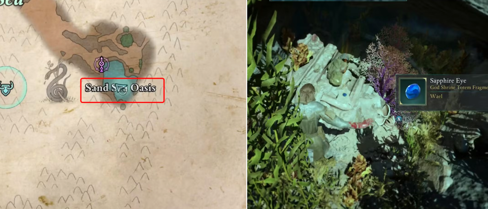 В прозрачных водах оазиса, на его дне, покоится древний артефакт – Сапфировый глаз. Близко с ним находятся останки давно погибшего путника, словно охраняя древнюю реликвию. Получить этот фрагмент несложно – достаточно нырнуть в прохладные воды оазиса и поднять артефакт со дна.