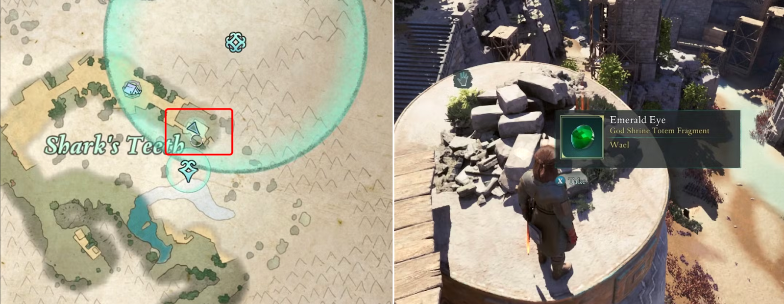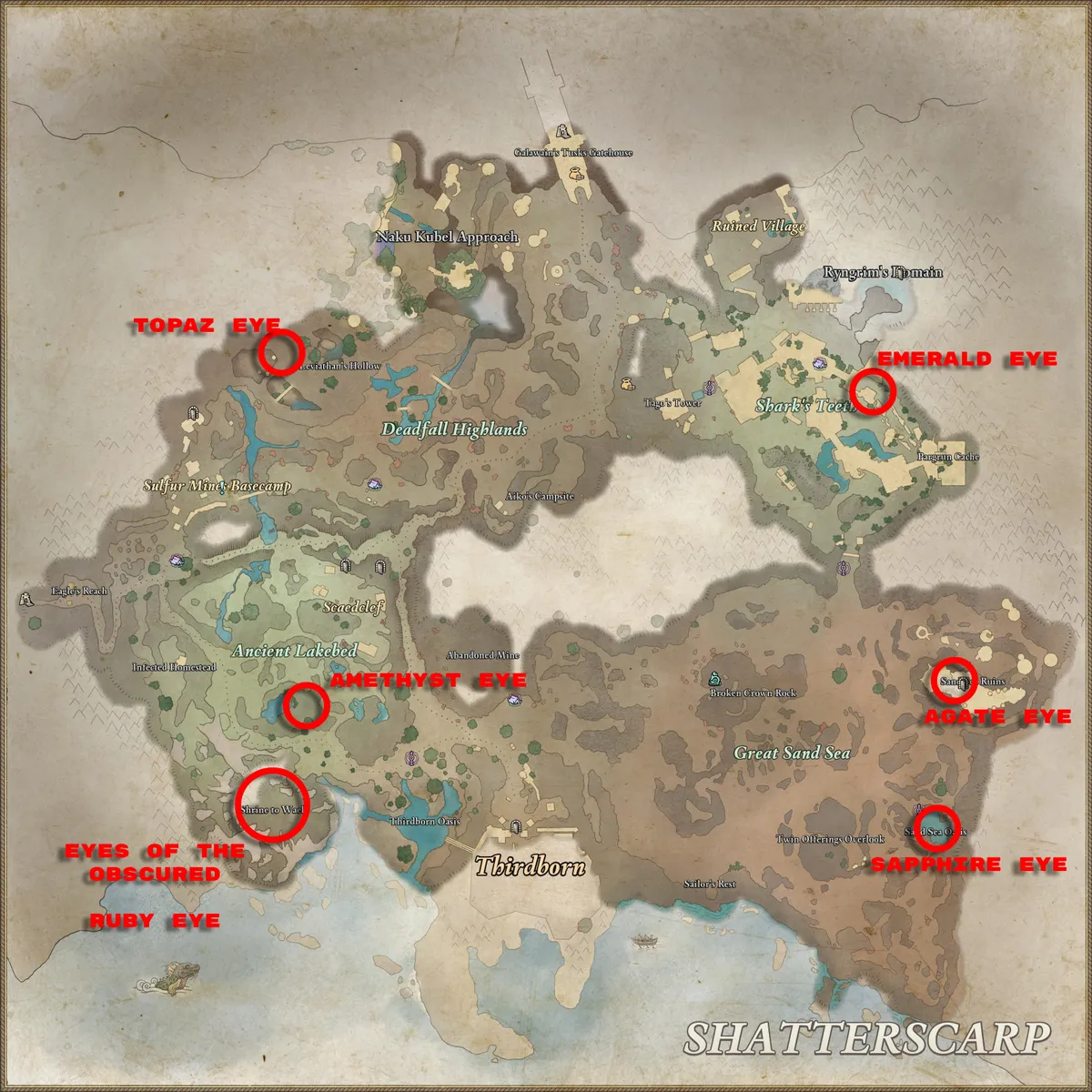 На северо-западе Расколотого утеса возвышаются величественные руины Акулий Зуб. Поблизости расположился временный лагерь исследователей, который послужит хорошим ориентиром. Повернувшись к юго-востоку от лагеря, вы увидите необычное зрелище – недостроенный монумент, обвитый деревянными строительными лесами. На его вершине притаился искомый Изумрудный глаз.