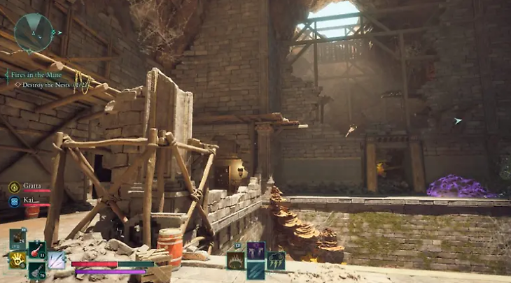 Продолжайте двигаться по рельсам вагонетки на восток, поднимитесь по лесам и обойдите их. На следующем гнезде повторите процесс – уничтожьте врагов и сожгите яйца, пока не очистите шахту от угроз.