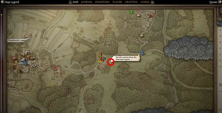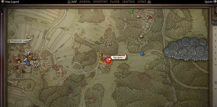 После начала миссии, отправляйтесь к Маркете, вдове из Тросковицы. Ее можно найти напротив ателье по вечерам. Поговорите с ней и передайте крест, сказав: «Прими этот символ искупления». Затем предложите свою помощь и скажите: «Давай отправимся на кладбище».