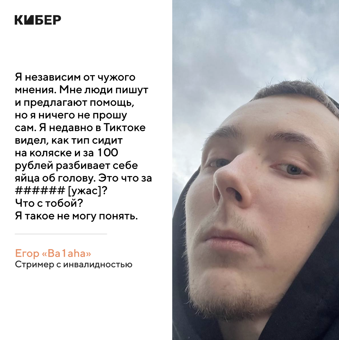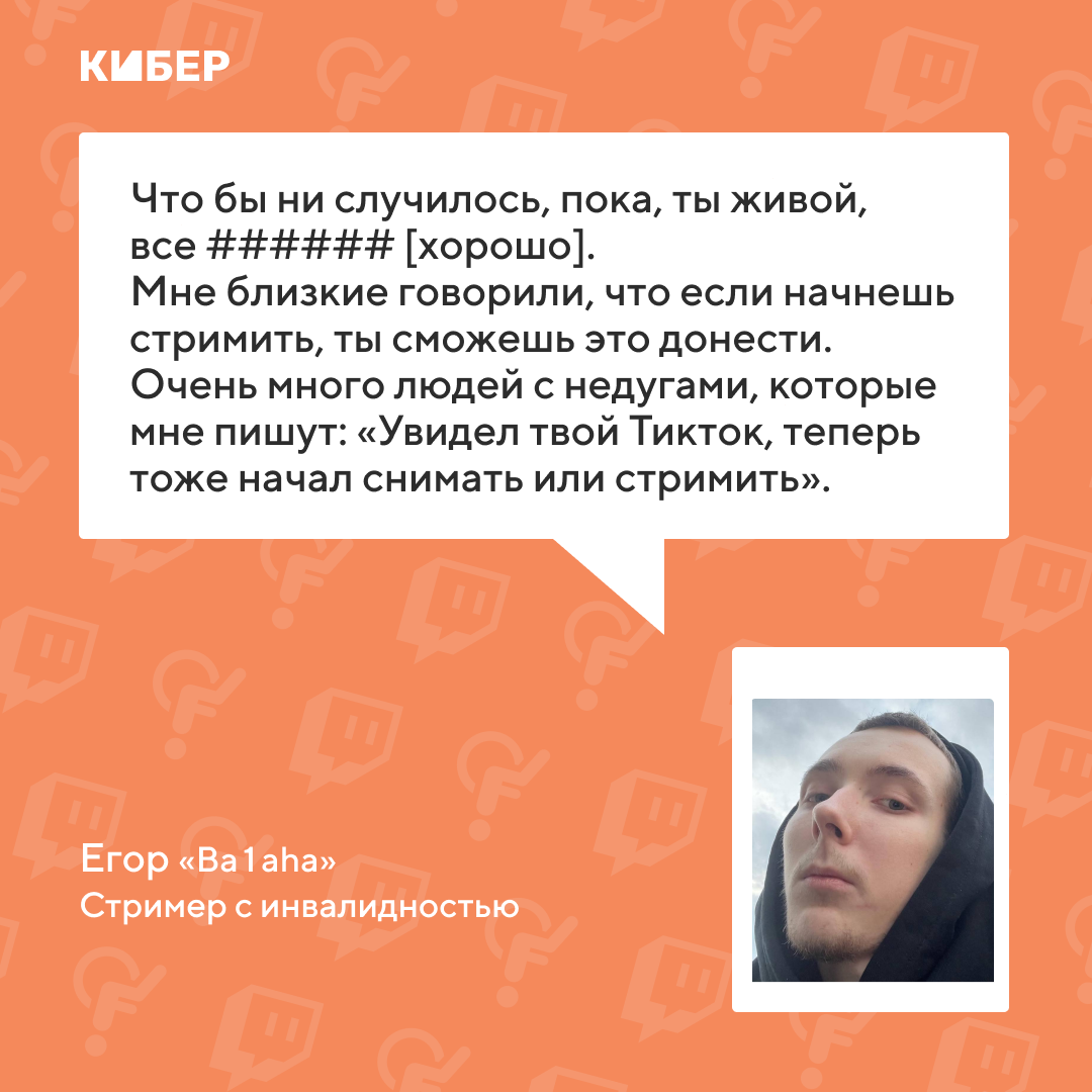 Очень много людей с недугами, которые мне пишут: «Увидел твой Тикток, теперь тоже начал снимать или стримить». То есть люди про себя думают, что они какие-то косые, больные, и боятся этого. А мне говорят: «Увидели тебя, хоть у тебя жизнь в 10 раз хуже, но мыслей таких нет».