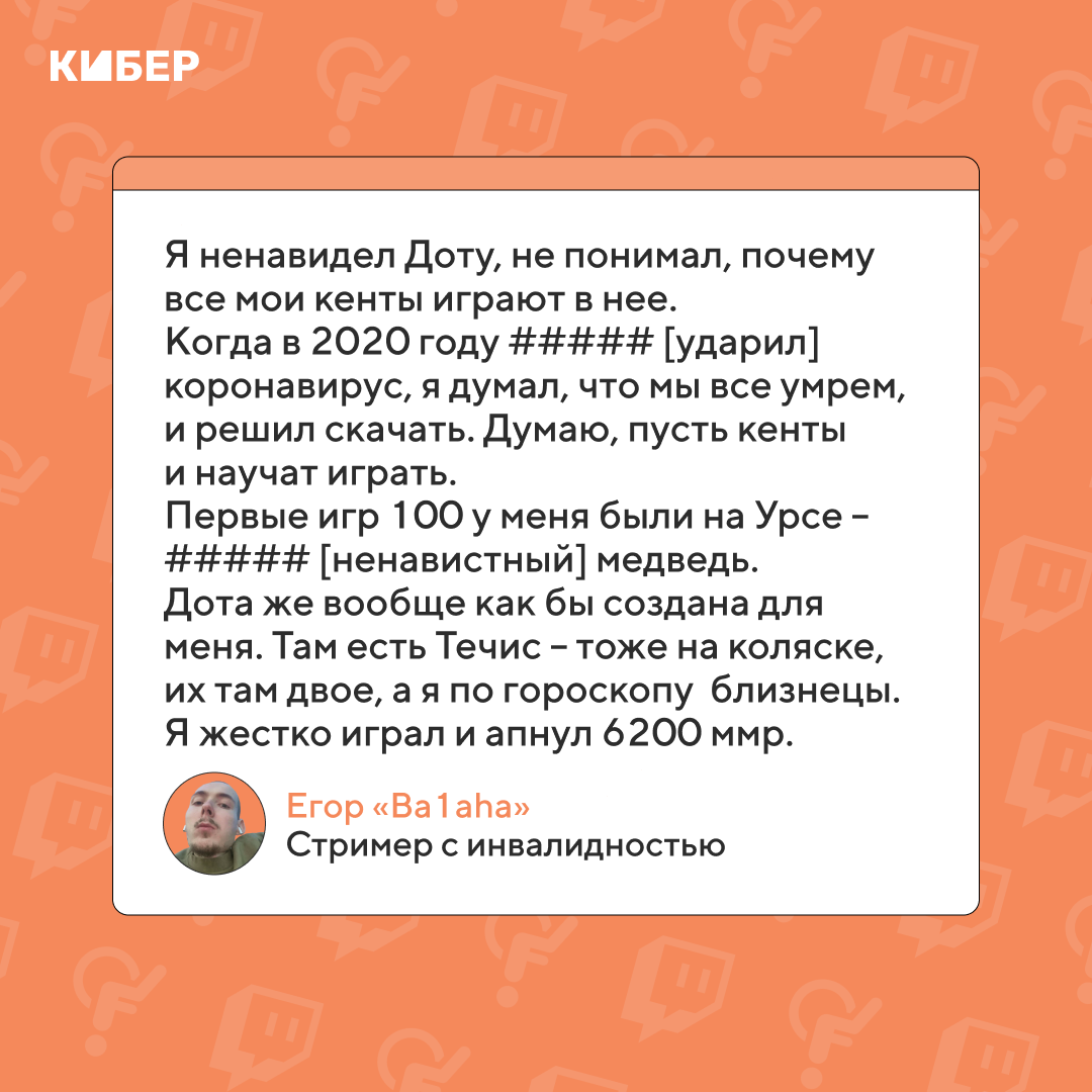 Егор «Ba1aha» Балащенко – 24-летний стример из Речицы, Беларусь. Он играет в CS и активно ведет трансляции на Твиче. У Егора спинальная мышечная атрофия (СМА) – болезнь, из-за которой он не может ходить. Его трансляции выглядят примерно так.
