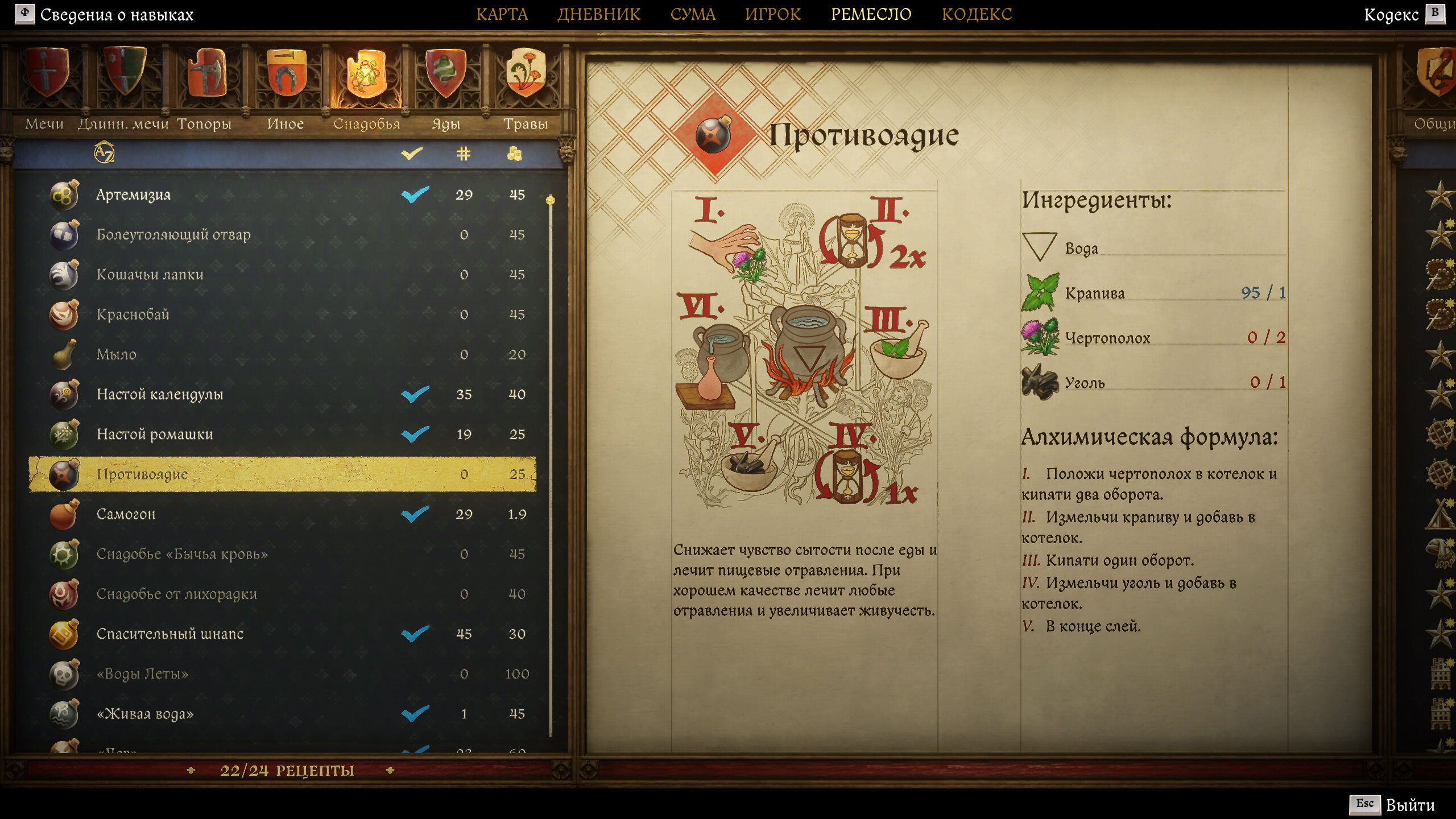 Велик соблазн переесть до 100+ пунктов, чтобы дольше не расходовать запас сытости, но в первом же бою после переедания игра расскажет вам, в чем была ошибка. Противоядие даже в слабом качестве снижает 20 пунктов сытости, а еще – очень пригодится, если вы не заметили и съели еду с менее чем 50% качества.