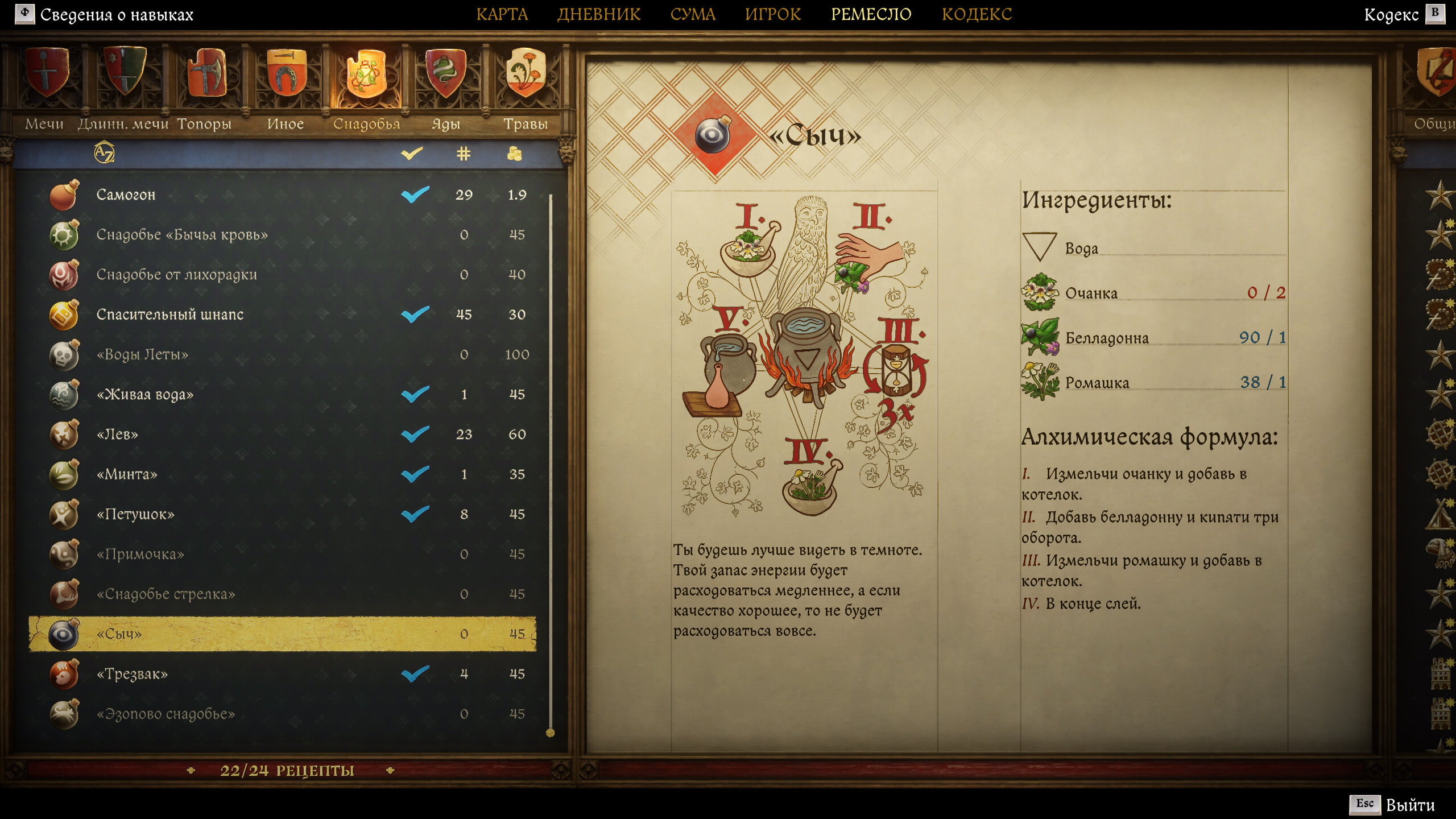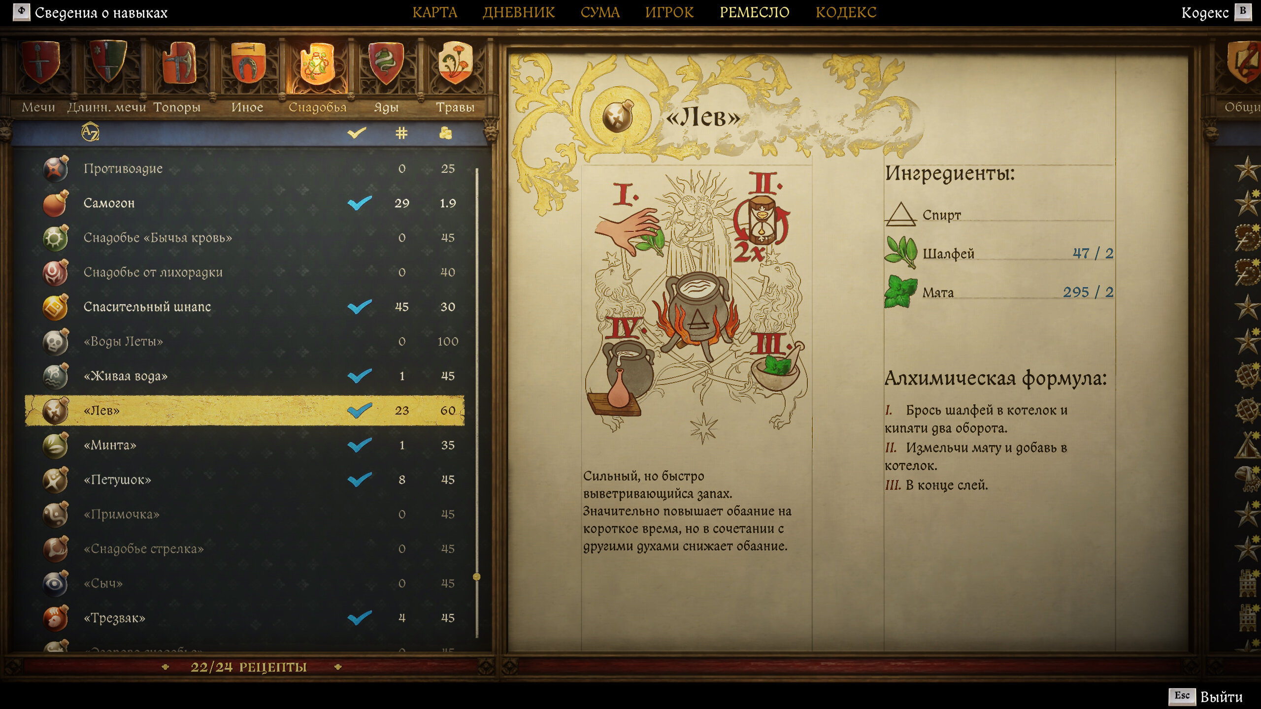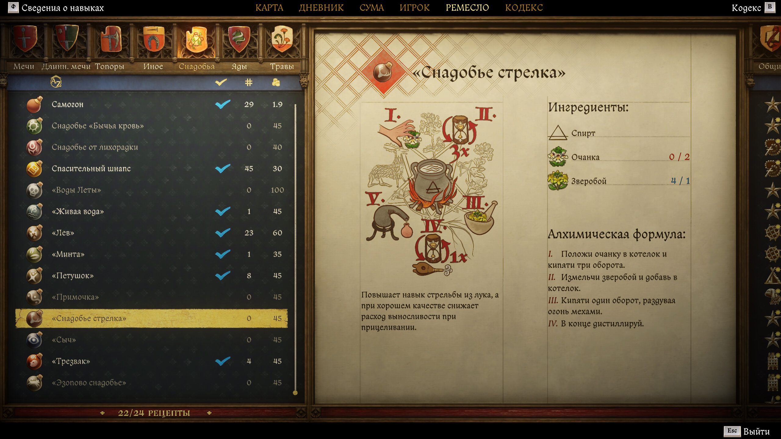 Зелье для сохранения при высоком уровне навыка алхимии дополнительно даст еще и баффы к силе, ловкости и живучести. Но это все еще алкоголь, а алкоголь влияет на некоторые вещи, поэтому лучше его не спамить каждые 5 минут. И особенно не сохраняйтесь через шнапс при изготовлении пороха – не зря же там в описании сказано, что это смертельно опасно. Хотя если вы проходите на 100% и все достижения, сделайте порох в пьяном виде ради эксперимента (и достижения).