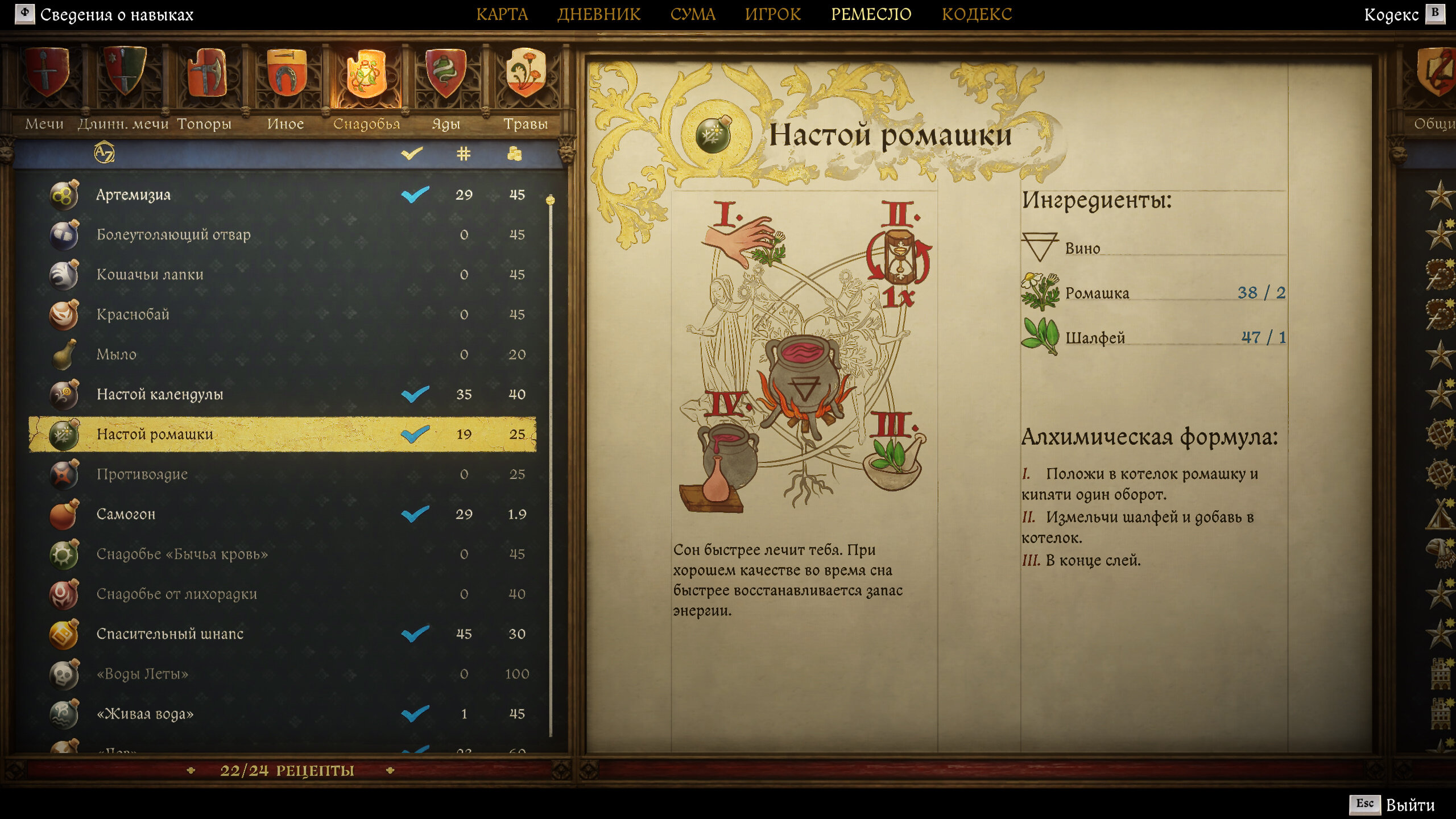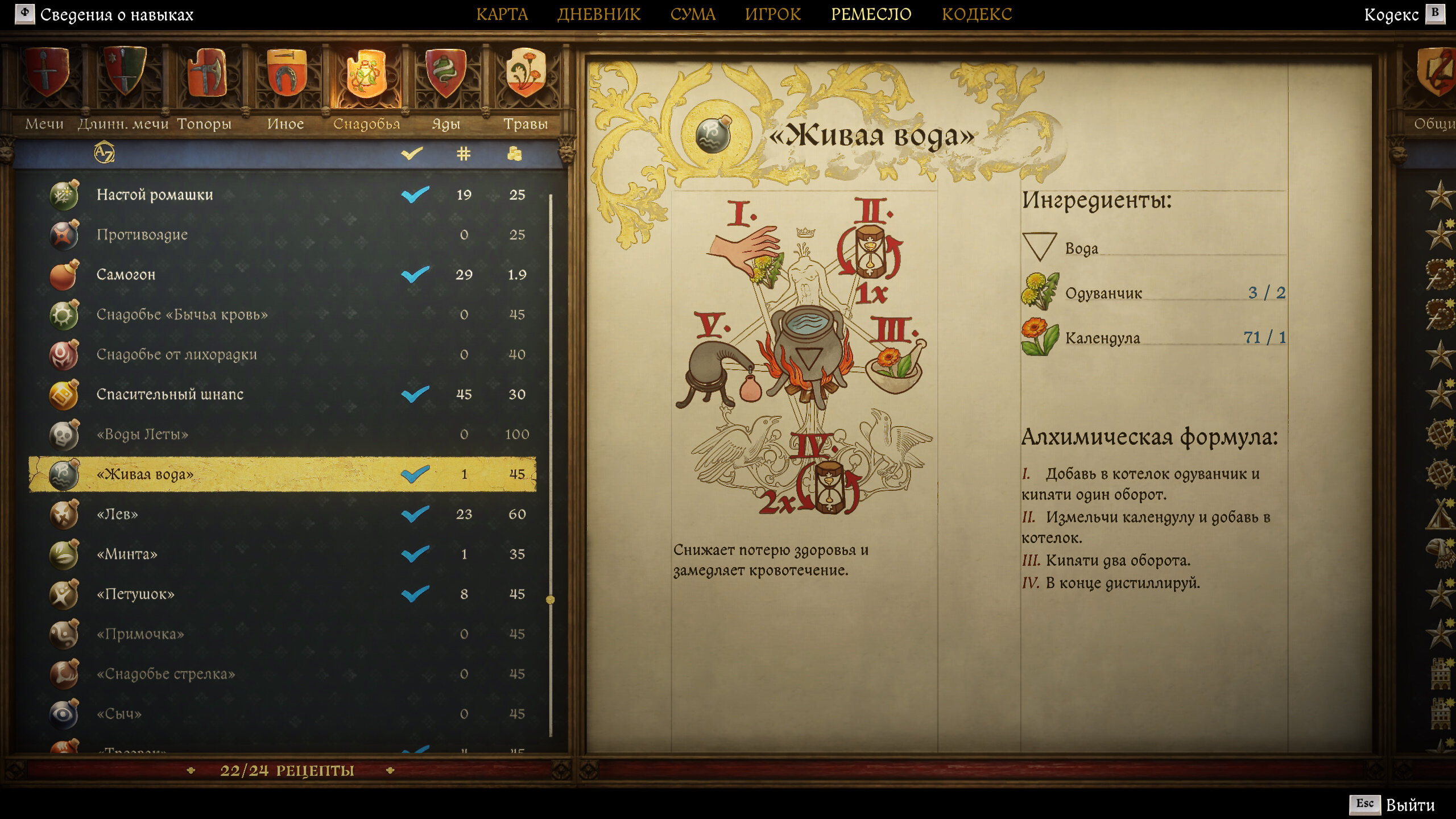 Некоторые сюжетные миссии не позволяют спать, чтобы вылечиться, и не дают далеко уходить от области задания, а драться в них приходится чаще обычного. В таких ситуациях стоит иметь под рукой настой календулы – всего минута вне боя, и примерно четверть здоровья восстановится.
