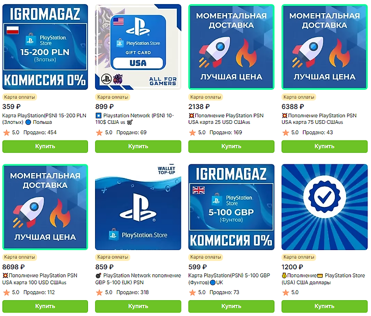 - зайдите на маркетплейс и найдите раздел с картами пополнения для PlayStation;