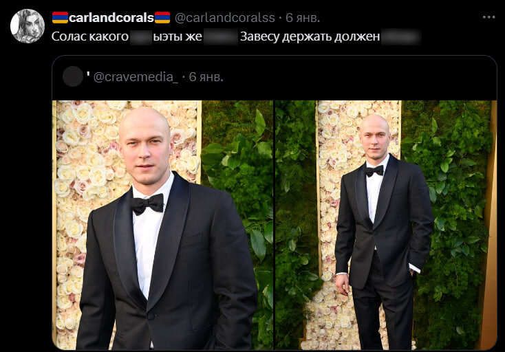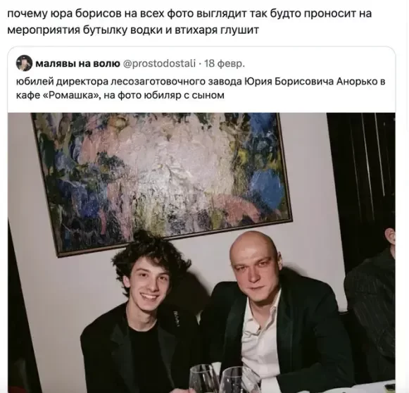 На премии Британской киноакадемии Борисов сфотографировался с Марком Эйдельштейном. На ней он как типичный русский родственник, который во время застолья спрашивает, в какой класс ты идешь, а тебе уже 28. Он выглядит так, будто вот-вот предложит действенную темку.