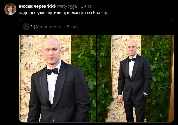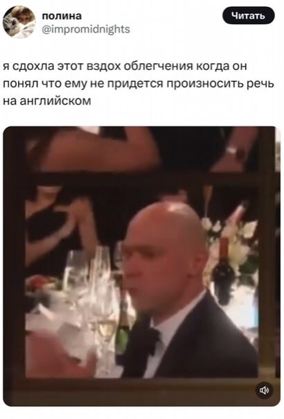 Когда на «Золотом глобусе» победил Киран Калкин, Борисов картинно выдохнул с облегчением. Ему не пришлось говорить речь на английском. Как позже он признался в интервью, у него в тот момент в голове был целый ворох мыслей. А когда объявили победителя, все вылетело из головы.
