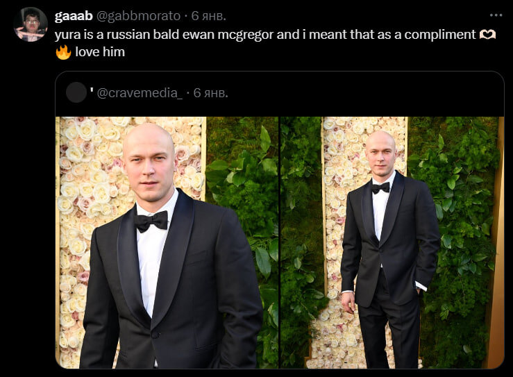 На красной дорожке Каннского кинофестиваля Юра выглядел потрясающе. Его сравнили с Соласом из Dragon Age и лысым Юэном Макгрегором, назвали следующим Лексом Лютором и пошутили про коллегу-актера из фильмов для взрослых.