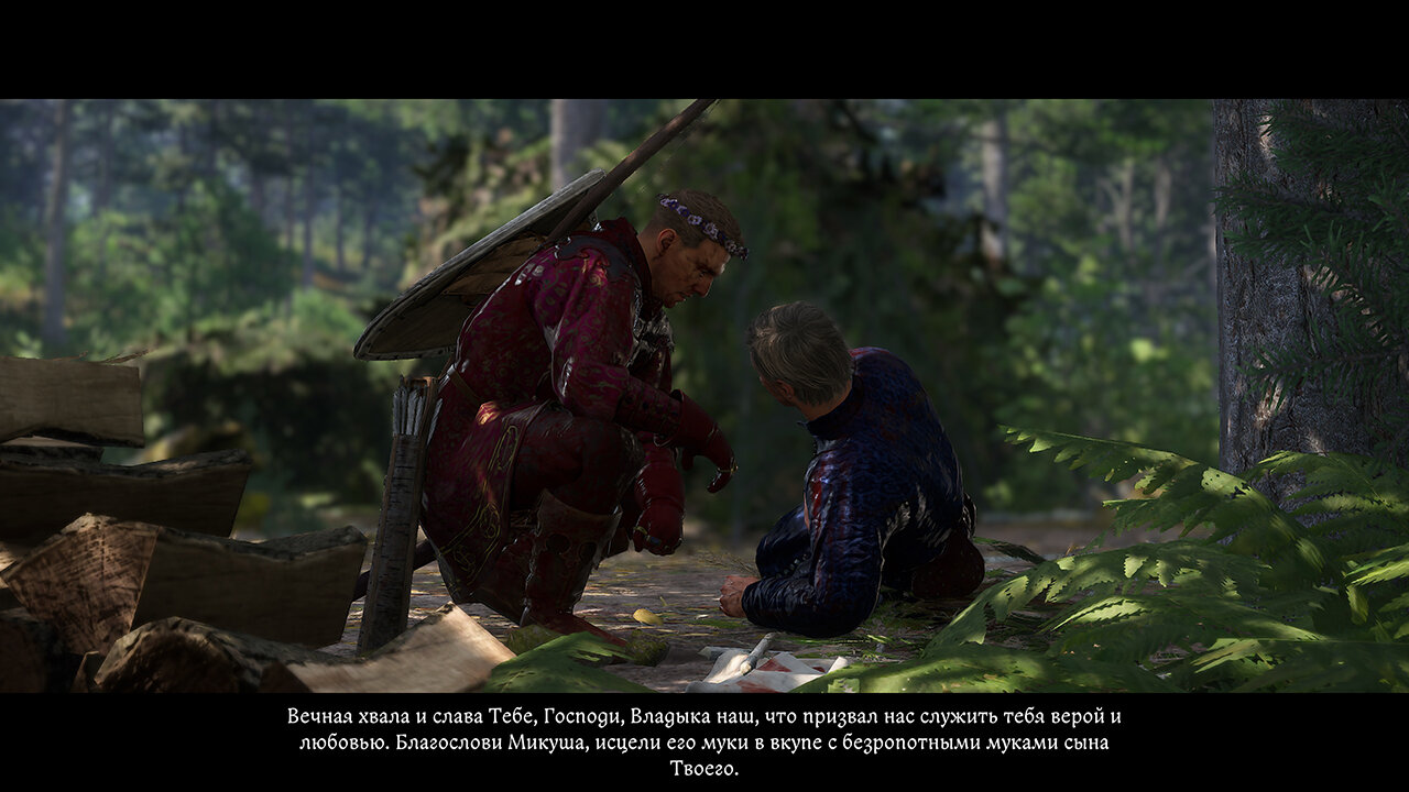 Дальше нужно будет помочь Микушу – но прежде чем начинать диалог, осмотрите местность. Вы найдете настой календулы для лечения, цветки пижмы для того, чтобы приложить к ране, и шнапс, чтобы промыть ее. Скорее всего, повязка у вас в инвентаре есть. Далее пройдите все методы лечения в диалоге, потом еще можно помолиться. Он скажет, что под пытками раскрыл, что жена знает про наследство, и теперь Сватава и Вендула в опасности.