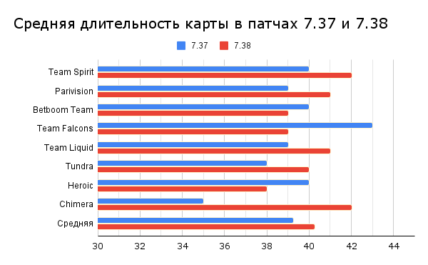 Если исключить аномально большую прибавку времени у Chimera, то получится, что средняя продолжительность одной карты практически не поменяется: 39,8 на 7.37 против 40 на 7.38.
