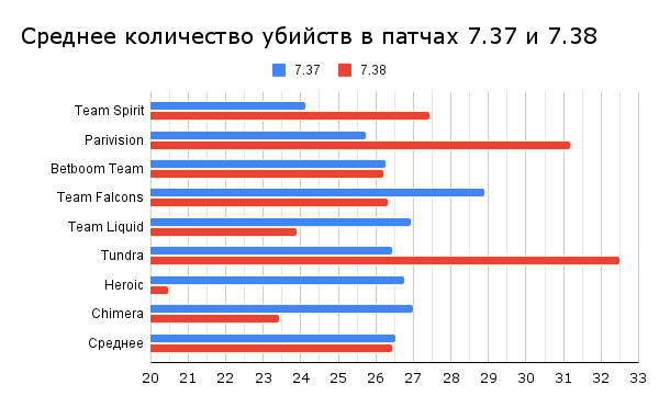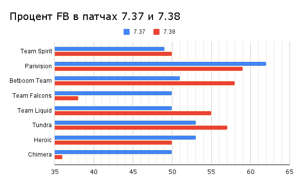 Патч 7.38 вышел в ночь на 20 февраля. Прошло уже больше десяти дней, а значит пора подводить первые итоги. Я решил сравнить некоторые показатели команд в разных патчах. Очевидно, что выборка матчей на 7.38 пока довольно маленькая, но, думаю, достаточная, чтобы отследить зарождение трендов.