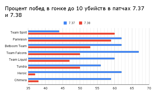 Для Team Spirit этот показатель остался практически неизменным, так что Larl prime продолжается вне зависимости от патча. А вот Team Falcons сильно просели, вероятно, сказывается отсутствие Стаса.