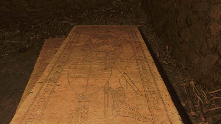 Спустившись в подземное помещение крипты, ориентируйтесь на большую бочку и сверните от нее вправо, чтобы попасть в следующую комнату. В этом помещении вы обнаружите массивный саркофаг, принадлежащий самому Валентину. Хотя при вскрытии гробница окажется пустой, не торопитесь покидать место. Внимательно исследуйте крышку саркофага – на ее поверхности вы найдете искусно выполненное изображение меча. Этот старинный рисунок позже послужит важным образцом для создания точной копии легендарного клинка.