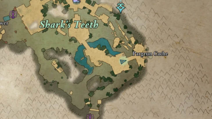 Чтобы найти этот загадочный тайник, вам нужно отправиться в юго-восточном направлении от карты Шаттерскарп, держа путь к области под названием «Зубы Акулы». Тайник расположен в самом юго-восточном углу региона. Не беспокойтесь о поиске входа – дорога к зданиям хорошо заметна и не требует особых усилий для обнаружения.